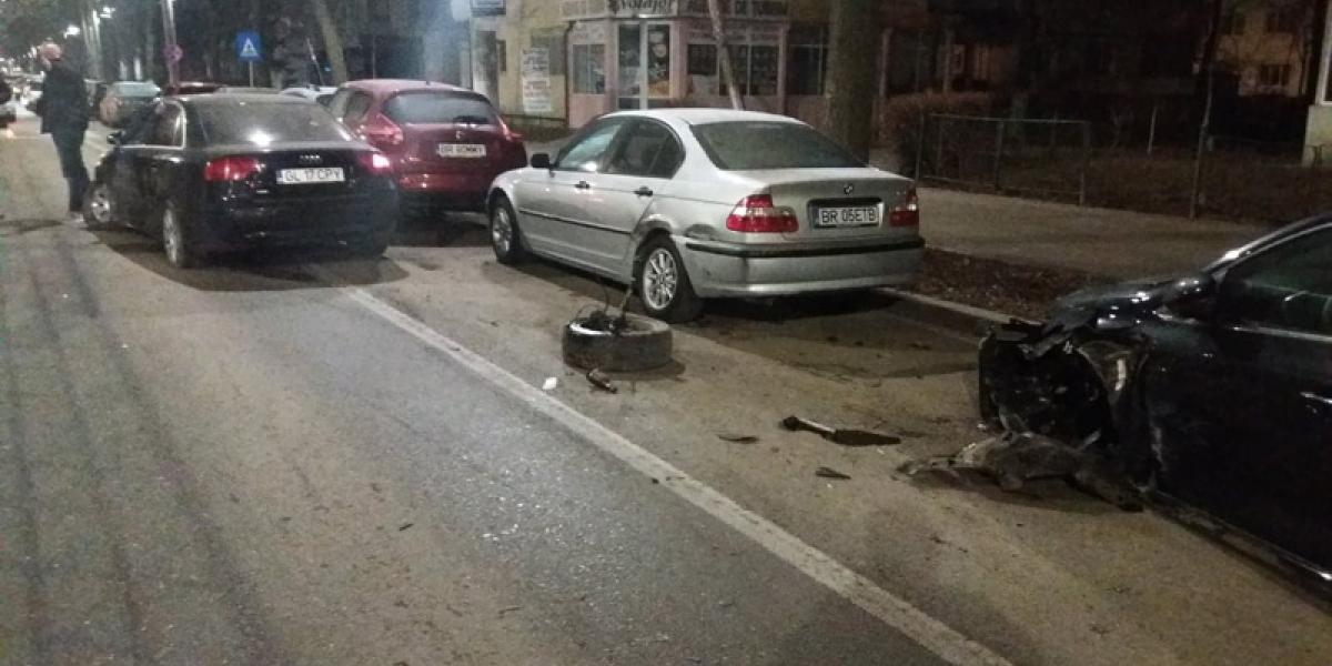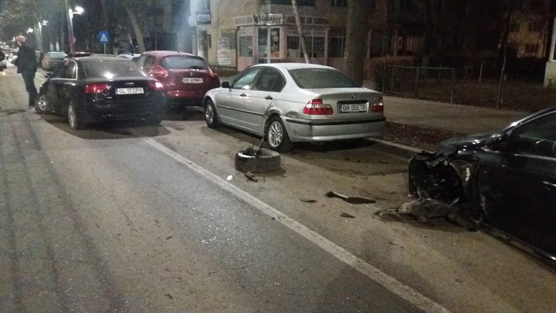 Şoferul unui Audi a intrat în două maşini parcate, un “Renault Megane” şi un BMW, la intersecţia Dorobanţi cu Tineretului. Evenimentul rutier s-a produs în noaptea de sâmbătă spre duminică, în jurul orei 3.00. Vinovat este un conducător auto care circula cu un autoturism Audi, înmatriculat în Galaţi, dinspre Şcolilor spre zona Barieră, acesta intrând cu forţă într-un auto Renault parcat. Izbitura a fost atât de puternică, încât autoturismului i-a zburat una dintre roţile din faţă, care a ajuns în mijlocul şoselei. După ce a lovit prima maşină, autoturismul Audi a ricoşat apoi într-un BMW parcat.