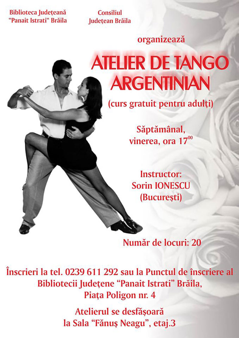 Începând de vineri, 21 octombrie, Biblioteca Judeţeană “Panait Istrati” organizează Atelierul de Tango Argentinian, susţinut de instructorul bucureştean Sorin Ionescu. Cursul este gratuit şi se adresează adulţilor, iar după cum ne-a declarat dr. Eduard Claudiu Brăileanu, şeful serviciului Relaţii cu Publicul, noul atelier propus de Biblioteca Judeţeană “Panait Istrati” vine să completeze oferta bogată de activităţi culturale adresate publicului brăilean. “Alături de dansurile populare româneşti şi de cele greceşti, tangoul argentinian va pune mai mult în valoare fondul Mediatecii, o secţie cu un extraordinar potenţial de dezvoltare”, a subliniat sursa citată, adăugând că activitatea va avea loc la Sala „Fănuş Neagu”, în fiecare vineri, de la ora 17.00.