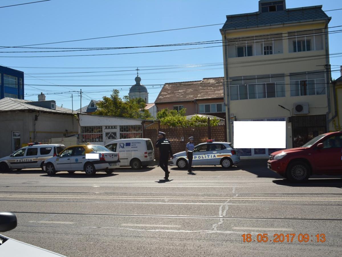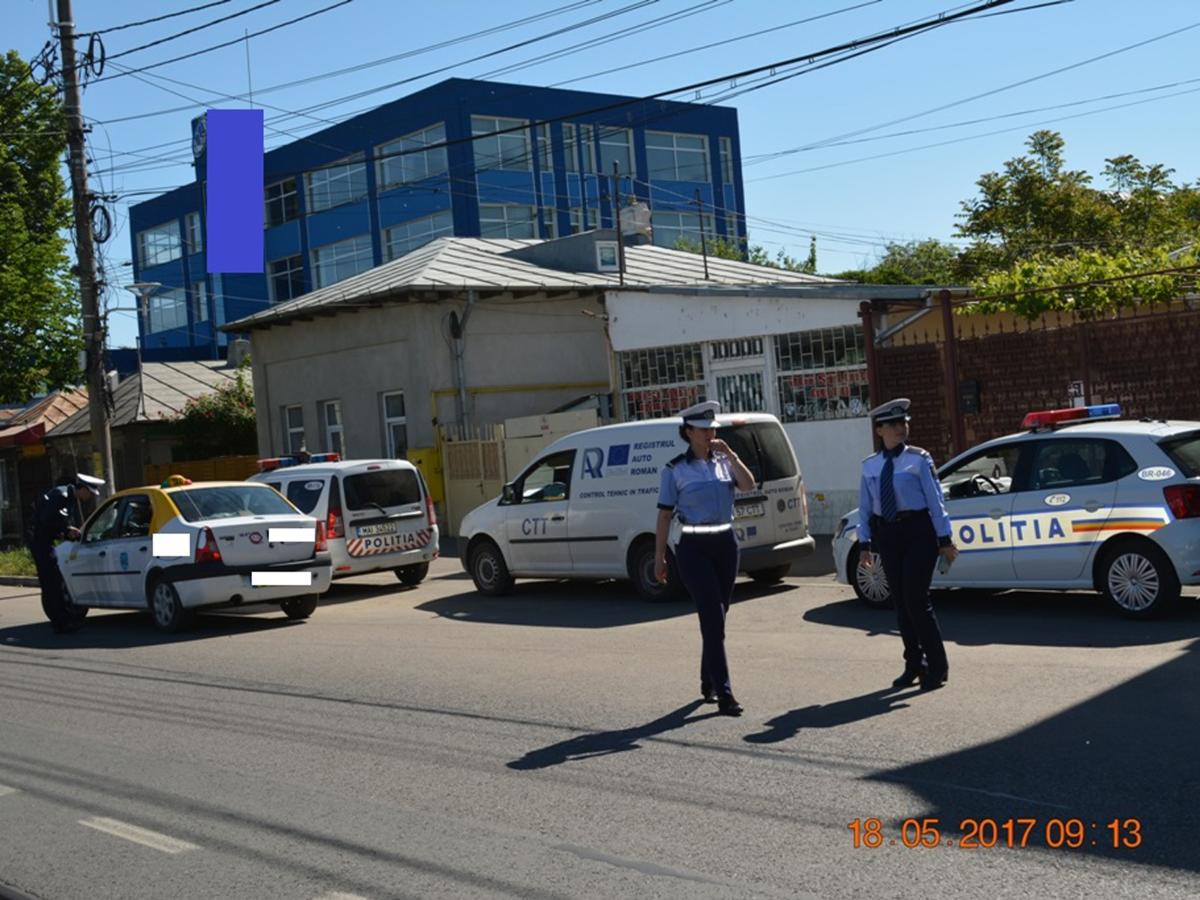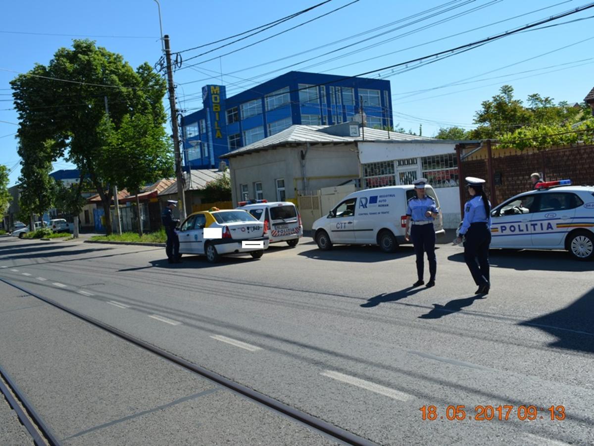 În jurul orei 10.00, a fost depistat în trafic un brăilean de 56 de ani, în timp ce conducea un taxi, pe Bulevardul Dorobanţilor, a cărui culoare nu corespundea cu datele trecute în certificatul de înmatriculare. Şoferul a primit o amendă şi i-a fost retras certificatul de înmatriculare.