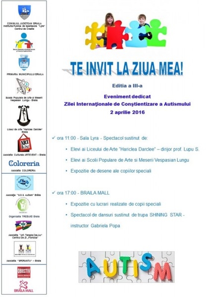În acest weekend, mai precis, sâmbătă, 2 aprilie 2016, asociaţiile SOS Autism Brăila,Trebuie, Speranţa şi Floricica organizează manifestarea "Te invit la ziua mea!", eveniment prilejuit de Ziua Internaţională de Conştientizare a Autismului.