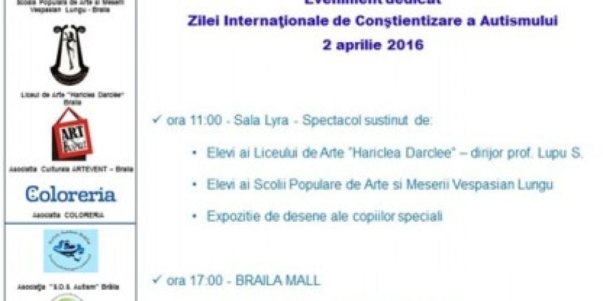 Manifestările încep la ora 11.00, la sala LYRA, cu un spectacol susţinut de elevi ai Liceului de Arte "Hariclea Darclee", dirijor prof. Ştefan Lupu, şi de elevi ai Şcolii Populare de Arte "Vespasian Lungu". În aceeaşi locaţie va fi prezentată şi o expoziţie de desene ale copiilor speciali. De la ora 17.00, Brăila Mall va găzdui o expoziţie cu lucrări realizate de copii speciali, eveniment continuat cu un spectacol de dansuri susţinut de trupa Shining Star.