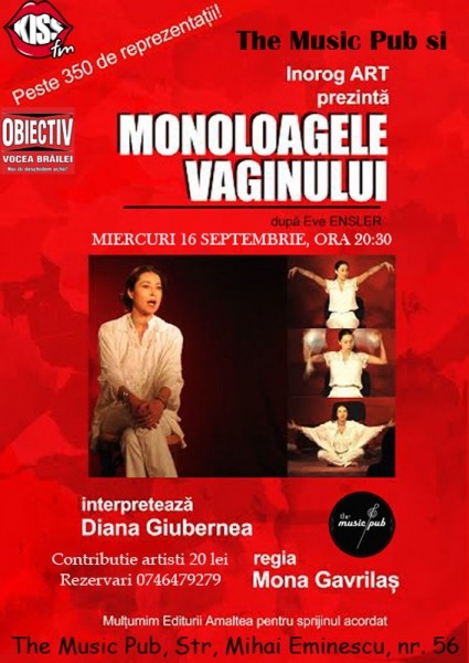 Piesa de teatru "Monoloagele Vaginului" care timp de patru ani la rând s-a jucat la Teatrul Nottara din Bucureşti cu sala plină, soseşte şi la Brăila într-un mediu neconvenţional. Aceasta va fi pusă în scenă în data de 16 septembrie, începând cu ora 20:30, la The Music Pub (Str. Mihai Eminescu, nr. 56). Foarte longeviv, spectacolul regizat de Mona Gavrilaş a stârnit interesul publicului din toată ţara. Această adaptare românească a unui text american celebru şi controversat la vremea apariţiei sale, scris de Eve Ensler, are câteva atuuri: subiectul abordat - universul feminin cu emoţiile şi trăirile specifice, viziunea regizorală care nu se bazează pe artificii, ci pe comunicarea cu publicul ce devine parte integrantă în spectacol şi, mai ales, jocul actoricesc al Dianei Giubernea, care reuşeşte să îşi schimbe identitatea, să călătorească în timp şi în spaţiu, împreună cu toţi cei din sală. "Nimeni nu pleacă indiferent de la spectacol, nimeni nu plecă la fel. Pe parcursul unei ore, bărbaţi şi femei se dezbracă de prejudecăţi. Piesa a fost tradusă în 40 de limbi şi jucată în peste 50 de ţări, stârnind un adevărat fenomen mondial, un manifest care a generat mişcarea mondială împotriva violenţei asupra femeilor. Textul lui Eve Ensler a devenit o provocare pentru actriţe şi regizori totodată", a declarat Cătălin Curcă, organizatorul evenimentului. Spectacolul "Monoloagele Vaginului" are cronici apreciative şi un premiu în cadrul Festivalului Internaţional al Teatrului de Studio, iar Diana Giubernea - premiul pentru cea mai bună actriţă. Acesta a avut peste 350 de reprezentaţii în Bucureşti şi în ţară, printre oraşele bifate în timp, numărându-se şi Brăila.