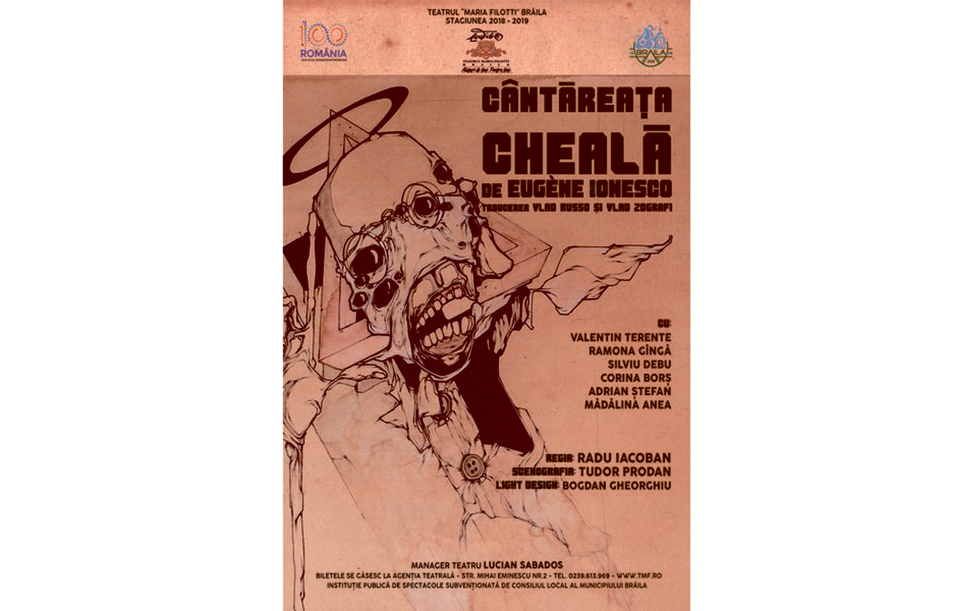 Astfel, spectacolul CÂNTĂREAŢA CHEALĂ, de Eugène Ionesco, a fost selectat în cadrul secţiunii concurs a Festivalului Comediei Româneşti -festCO, organizat de Teatrul de Comedie în perioada 25 mai – 2 iunie 2019. Producţie a Teatrului “Maria Filotti” în regia lui Radu Iacoban, piesa a fost vizionată de comisia de selecţie a Galei UNITER 2019 şi are o distribuţie de excepţie: Valentin Terente, Ramona Gîngă, Silviu Debu, Corina Borş, Adrian Ştefan, Mădălina Anea.