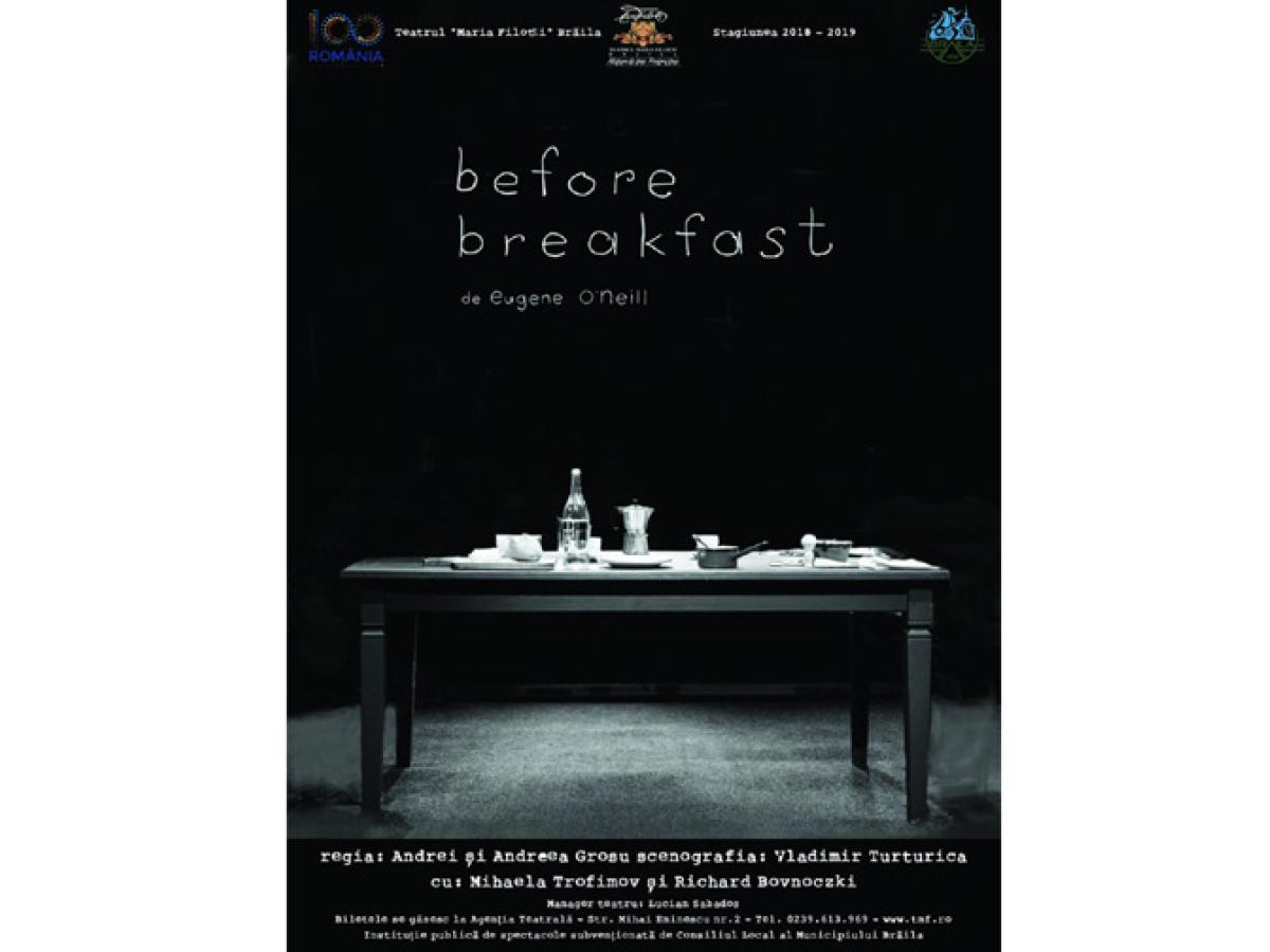 Spectacolul BEFORE BREAKFAST a deschis cea de a XII a ediţie a Festivalului “Zile şi Nopţi de Teatru la Brăila” şi reprezintă, atât pentru teatru cât şi pentru cei doi regizori, dar mai ales pentru cei doi redutabili actori, Mihaela Trofimov şi Richard Bovnoczki, ocazia unei demonstraţii teatrale de mare intensitate, emoţie şi performanţă actoricească. Cadrul scenografic, creat cu rafinament de Vladimir Turturică, minimalist, dar esenţializat şi personalizat, devine al treilea “actor” al acestei drame.
