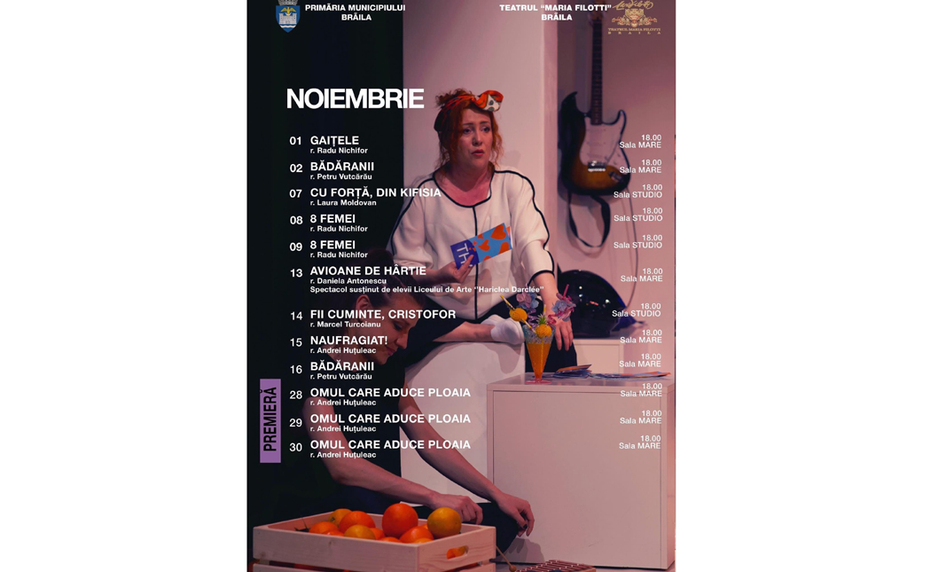» JOI 13 noiembrie, Sala Mare, ora 18:00, “AVIOANE DE HÂRTIE“, de Elise Wilk, regia Daniela Antonescu. Spectacol susținut de elevii Liceului de Arte “Hariclea Darclée“.