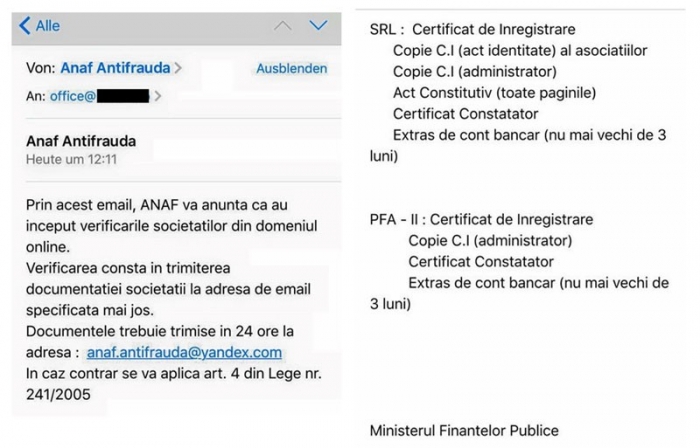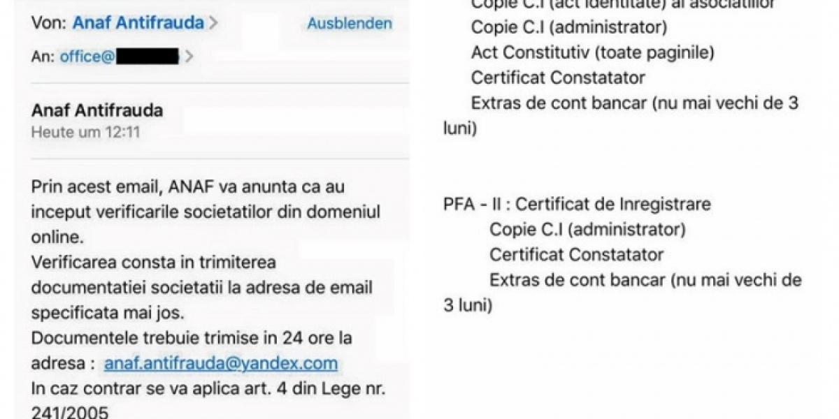 În acelaşi material se prezintă şi un exemplu concret de tentativă de phishing având ca origine adresa de email antifraudaromania@papayasel.net. Mesajul suspect cerea ca răspunsul, incluzând mai multe documente (printre care actul constitutiv al societăţii, extras de cont bancar şi cărţile de identitate ale asociaţilor), să fie transmis către o altă adresă de email, anaf.antifrauda@yandex.com, în termen de 24 de ore. "Prin acest mesaj, ANAF vă anunţă că au început verificările societăţilor din domeniul online. Verificarea constă în trimiterea documentaţiei societăţii la adresa de email specificată mai jos. Documentele trebuie trimise în 24 de ore la adresa: anaf.antifrauda@yandex.com. În caz contrar, se va aplica art.4 din Lege nr 241/2005", se arată în mesajul de tip phishing.