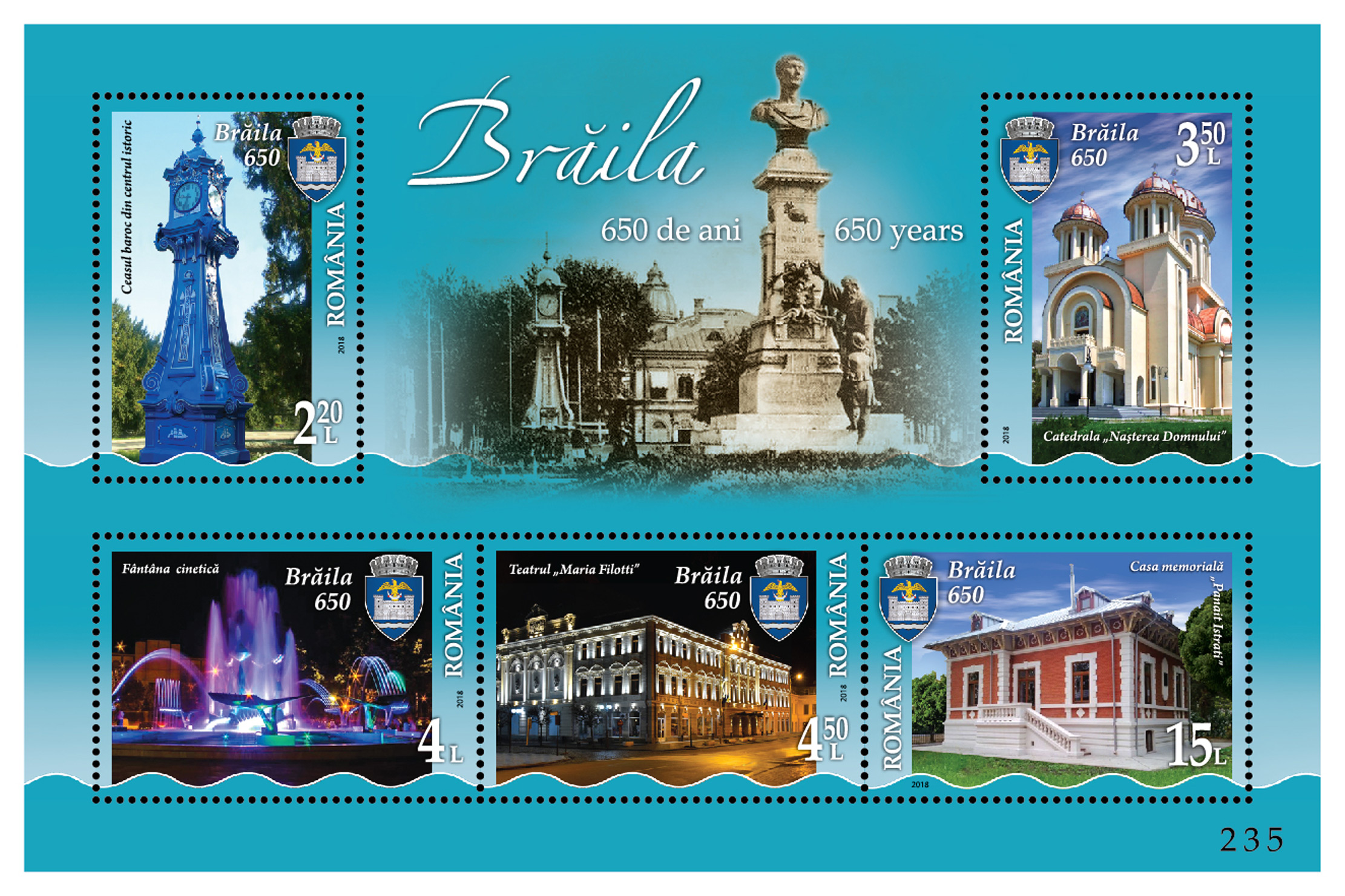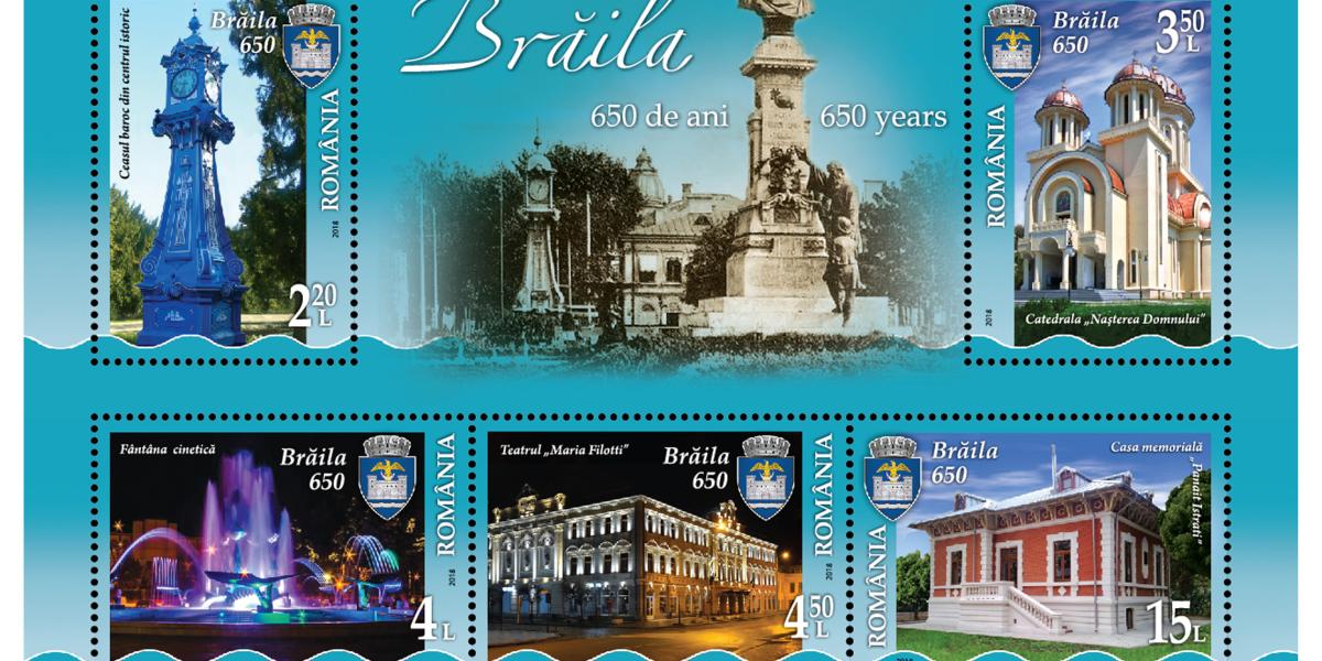 În pragul anului ce marchează şase secole şi jumătate de la prima atestare documentară, Brăila se poate mândri cu o emisiune filatelică de cinci timbre care înfăţişează unele dintre cele mai reprezentative obiective ale oraşului. Timbrele au fost tipărite de “Romfilatelia”, la iniţiativa Asociaţiei Filatelice “Dunărea” Brăila şi a Primăriei. “Am păşit în anul Centenarului Marii Uniri cu prima emisiune filatelică dedicată unui oraş din România. Brăila, oraşul cu una dintre cele mai timpurii atestări documentare, este al treilea oraş ca vechime al ţării, după Câmpulung şi Curtea de Argeş. Scriitorul Panait Istrati spunea despre Brăila că, în urma Războiului de Independenţă din 1877, a devenit cel mai important oraş-port al Dunării, care în perioada respectivă «înota» în aur, locuitorii bucurându-se de prosperitate. Brăilenii se mândresc cu bogata istorie locală, fiindu-le foarte greu să facă o ierarhie a obiectivelor care dau identitate oraşului”, precizează conducerea “Romfilatelia”.