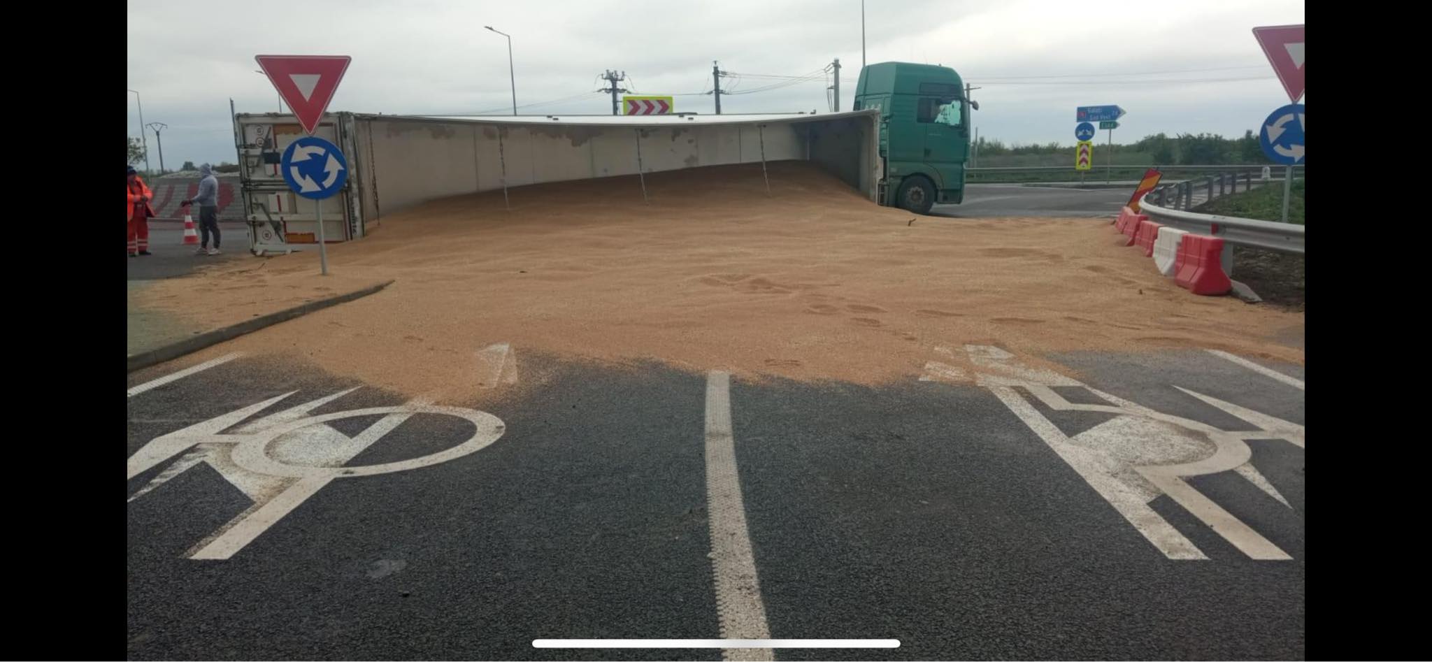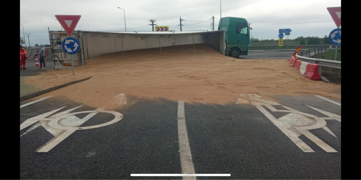 Vineri dimineață, în jurul orei 8.00, un tir încărcat cu cereale s-a răsturnat, la intersectia DN2B cu DN2S, drumul de legătură cu podul peste Dunăre. Poliția transmite că nu au fost victime, consemnându-se doar pagube materiale. Cerealele împrăștiate pe carosabil au afectat circulația, traficul derulându-se pe o singură bandă. Foto: Pro Braila