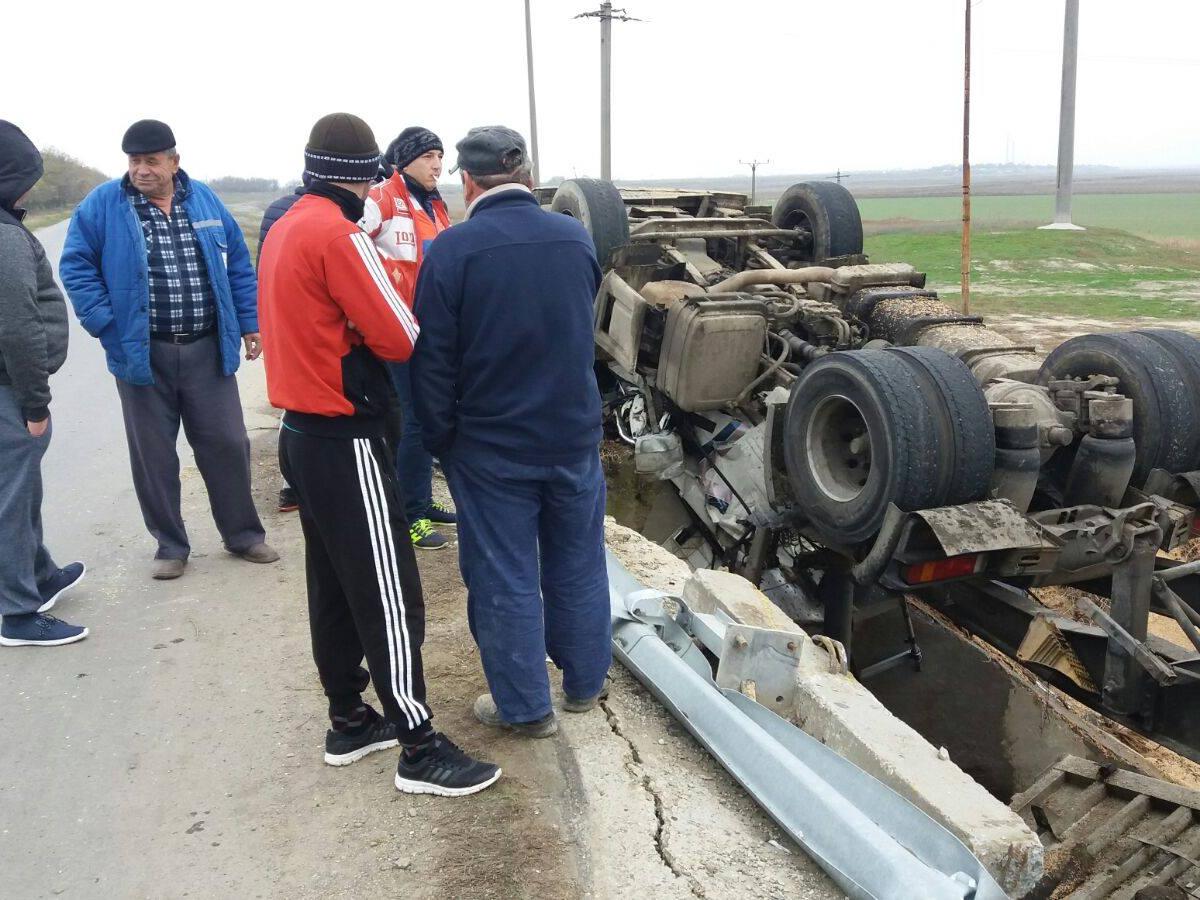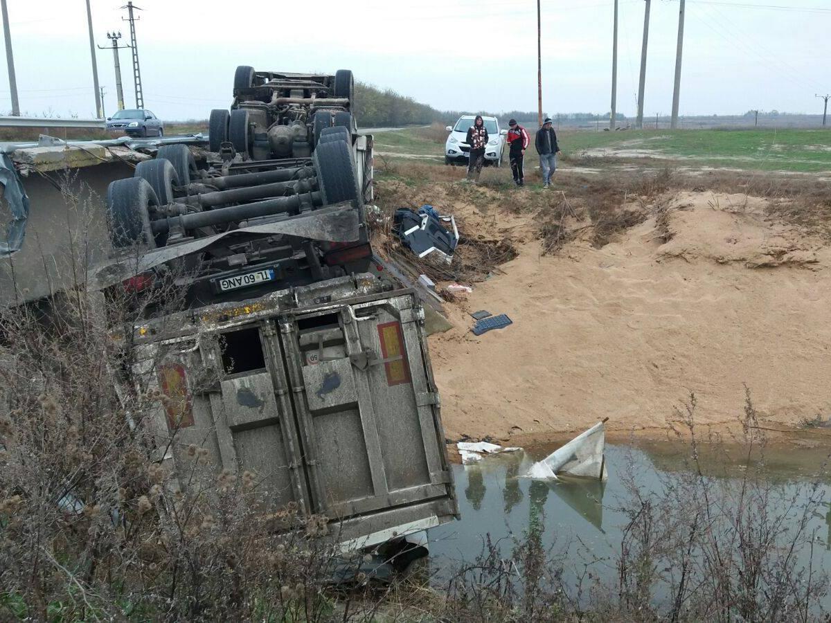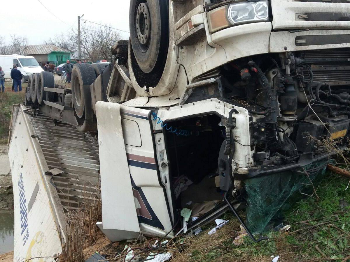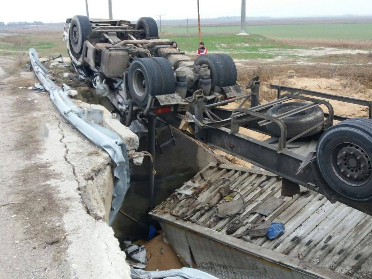 * azi-noapte, şoferul constănţean al unui autotren nu a mai putut stăpâni volanul într-o curbă şi s-a răsturnat peste un canal * au intervenit lucrătorii de la ISU pentru descarcerarea şoferului, dar TIR-ul nu a putut fi ridicat azi-noapte şi s-a intervenit astăzi