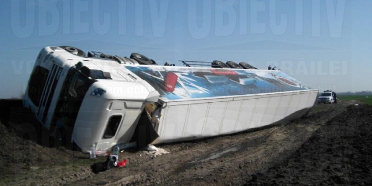 Un TIR cu semiremorcă s-a răsturnat ieri, în jurul orei 04.30 dimineaţa, într-un şanţ, la ieşirea din localitatea Silistraru. Acesta era încărcat cu saci de fasole, dar nu a mai ajuns la destinaţie, şoferul ieşind de pe carosabil într-o curbă periculoasă, la km 85, pe DN 2B. Din primele cercetări efectuate de poliţişti a reieşit că Victor V. de 29 de ani, din Republica Moldova, a adormit la volan, a intrat pe contrasens, apoi s-a răsturnat în şanţul destul de abrupt de pe marginea şoselei. Din fericire, în momentul producerii accidentului, nu circula niciun autoturism din sensul opus. În urma testării cu aparatul etilotest, s-a constatat că şoferul nu consumase băuturi alcoolice. Neexistând urme de frânare, oamenii legii merg pe varianta oboselii manifestate la volan.