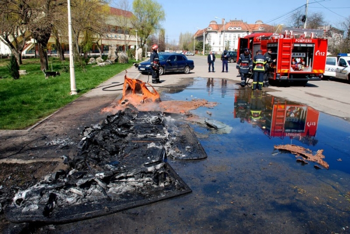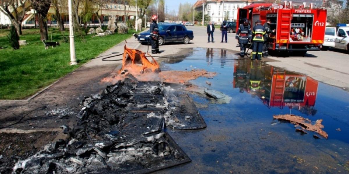 În ciuda intervenţiei rapide a unui echipaj de pompieri, cabinele din plastic s-au făcut scrum. Conţinutul lor s-a împrăştiat pe trotuar, iar mirosul în zonă a devenit insuportabil.
