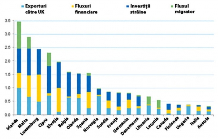 Așa cum era de așteptat, Irlanda va fi țara cel mai greu lovită de schimbarea relațiilor dintre UE și Marea Britanie. Motivul este unul geografic: toate drumurile irlandezilor duc la Londra pentru simplul motiv că țara lor se află dincolo de Regatul Unit. Următoarele state sunt Malta, o fostă colonie britanică, și Luxemburg. Locul patru aparține unei alte foste colonii britanice, Cipru, urmată de Elveția și Belgia. Olanda, Spania și Norvegia se află de asemenea în prima linie, iar Suedia încheie Top 10. Franța și Germania ocupă locurile 11, respectiv 12, iar Italia și Austria - locurile 19, respectiv 20.