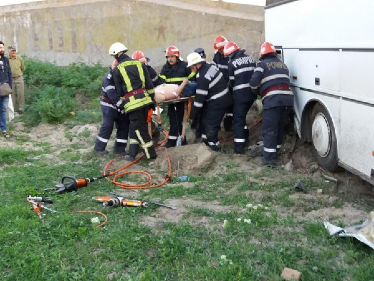 • ieri, un eveniment rutier grav, în care au fost implicate un autocar din Ucraina şi un autoturism condus de o femeie, s-a produs pe DN 2B, la ieşire din localitatea Baldovineşti • şoferiţa de 59 de ani se afla la volanul unui “Volkswagen Golf” şi, la un moment dat, a ajuns pe contrasens, intrând în coliziune cu autocarul condus de un ucrainean de 42 de ani • acesta a încercat să evite impactul, mai ales că în autocar erau 51 de pasageri, a tras de volan, dar a lovit acostamentul de cale ferată • în urma impactului dintre autocar şi maşină au rezultat 9 victime, trei persoane rămânând încarcerate • în stare foarte gravă sunt şoferiţa şi un pasager din maşină, de numai 16 ani