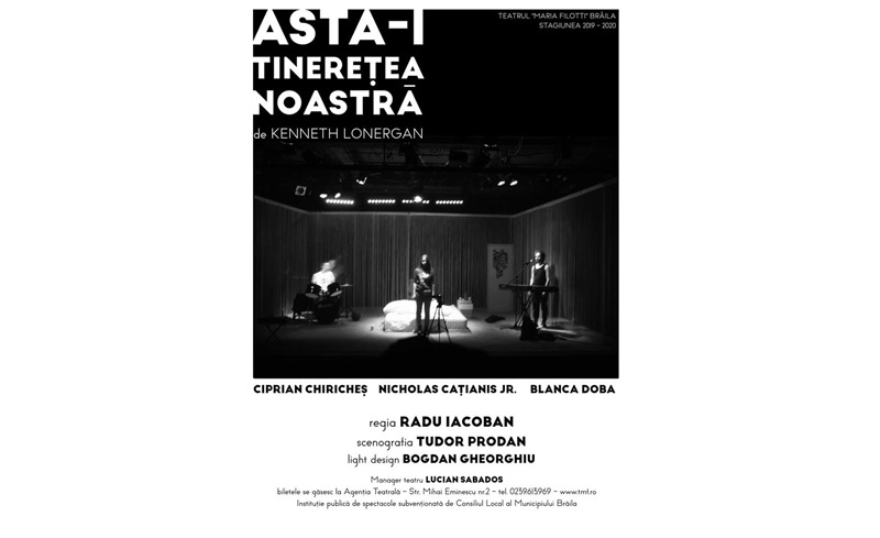 “ASTA-I TINEREŢEA NOASTRĂ”, piesa regizorului, dramaturgului şi scenaristului american, Kenneth Lonergan, prima producţie TMF a anului, care propune o echipă de spectacol extrem de interesantă. Radu Iacoban, după succesul cu Cântăreaţa cheală a lui Eugene Ionesco, revine şi semnează regia, cu scenografia lui Tudor Prodan şi muzica originală a Aidei Sosic. În cele trei roluri au fost distribuiţi Nicholas Caţianis, Blanca Doba, cei mai tineri actori ai Teatrului “Maria Filotti”, alături de Ciprian Chiricheş, invitat din Bucureşti, absolut toţi extrem de dedicaţi şi talentaţi. Piesa lui Kenneth Lonergan a stat la baza unor producţii impresionante pe Broadway şi West end, avîndu-i în distribuţie pe deja celebrii Matt Damon şi Jake Gylenhall. O poveste fascinantă despre noptea maturizării, despre intrarea î viaţa reală şi renunţarea la teribilism.