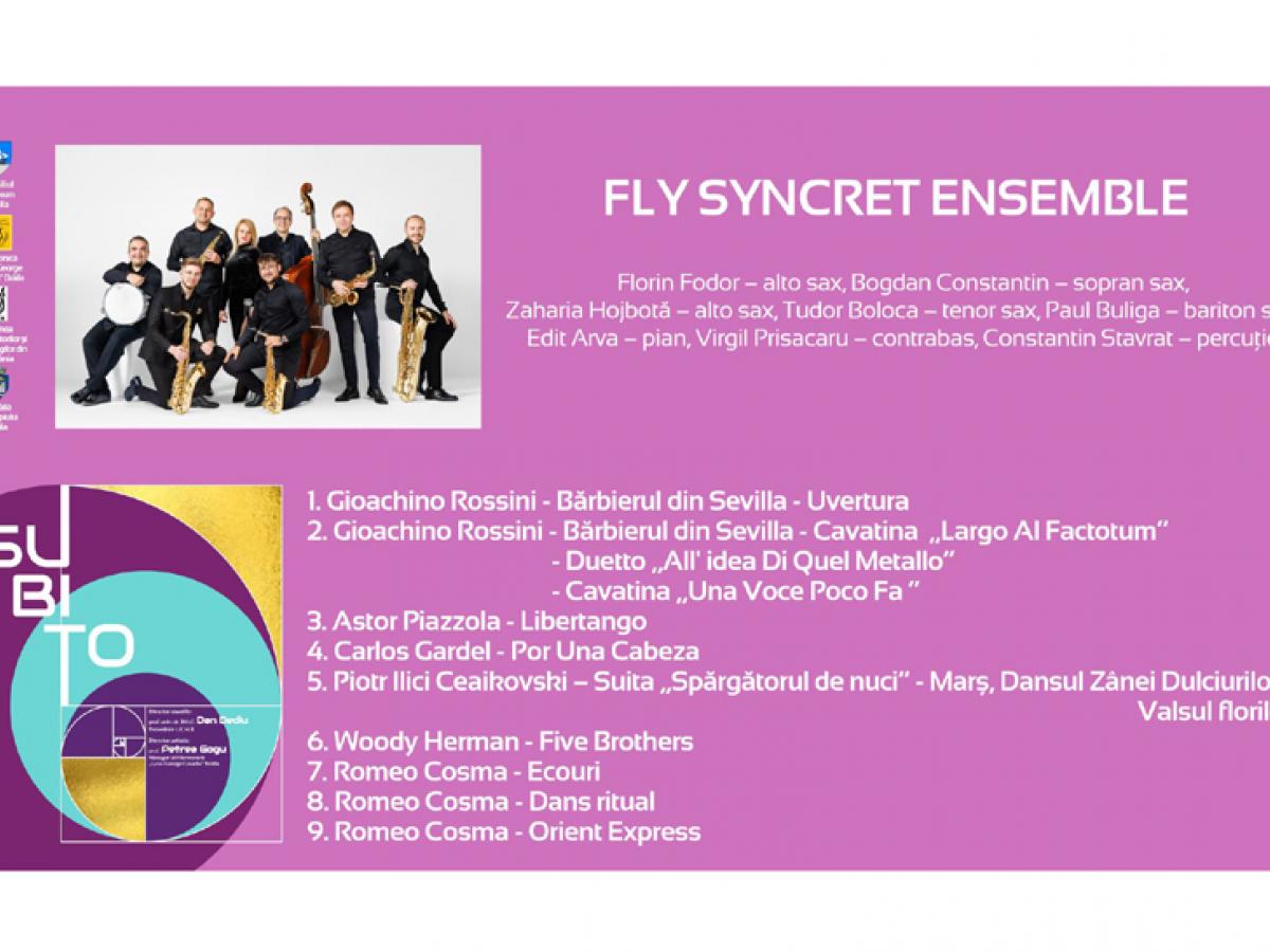Mai mult decât un ansamblu cameral, Fly Syncret Ensemble este o formulă interpretativă unică, în care artiști de renume internațional și discipolii lor - toți reprezentanți ai Universității Naționale de Arte „George Enescu” din Iași - se întâlnesc într-un limbaj comun, sincretic, ce reunește muzica clasică, jazz-ul și pop-ul. Ansamblul are o structură flexibilă, în cadrul căruia, în funcție de repertoriul abordat, pot face parte mai mulți membri. Pentru Festivalul Național de Muzică de Cameră „Subito”, organizat de Filarmonica „Lyra - George Cavadia” din Brăila, Fly Syncret Ensemble propune o distribuție formată din opt instrumente: cvintet de saxofoane, pian, percuție și contrabas.