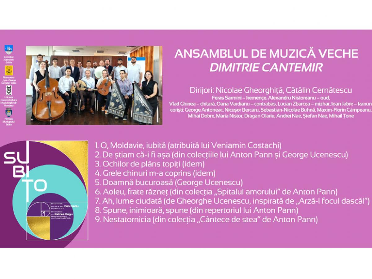 Ansamblul de muzică veche „Dimitrie Cantemir” al Universității Naționale de Muzică este o inițiativă dedicată redescoperirii și valorificării patrimoniului sonor autohton, cu accent pe repertoriile românești din secolele XVIII-XIX, păstrate în manuscrise bizantine. Format din profesori, studenți, alumni ai UNMB și colaboratori apropiați ai formației „Psalmodia”, ansamblul se remarcă prin autenticitatea interpretării și prin proiecte care readuc în atenția publicului muzici uitate, încărcate de sensibilitate și rafinament, cum este albumul Spune, inimioară, spune, inspirat din creația lui Anton Pann. Cofondatorii și dirijorii ansamblului, Nicolae Gheorghiță și Cătălin Cernătescu, sunt personalități de referință în domeniul muzicologiei românești. Nicolae Gheorghiță, profesor universitar, prorector al UNMB și vicepreședinte al Uniunii Compozitorilor și Muzicologilor din România, este specialist în paleografie și interpretare bizantină, autor al unor volume premiate de Academia Română și dirijor al ansamblului „Psalmodia”. Cătălin Cernătescu, cercetător științific la UNMB și președinte al Asociației REVIVART, este editor, compozitor și autor al unor lucrări de referință privind cântul sacru, fiind activ implicat în valorificarea manuscriselor muzicale.