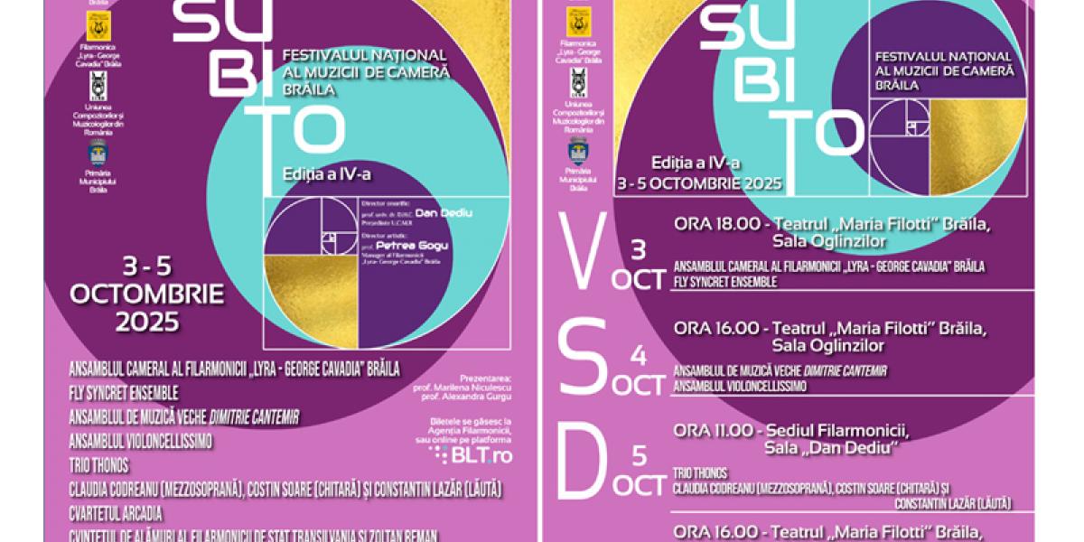 Vineri, 3 octombrie, începe Festivalul Național al Muzicii de Cameră SUBITO de la Brăila, care propune, timp de trei zile, întâlniri memorabile cu ansambluri și artiști de renume, diversitatea lor și originalitatea repertoriilor dând naștere unor adevărate „arhitecturi sonore” unde tradiția, clasicul și contemporanul se completează în mod firesc. Evenimentul este organizat de Consiliul Județean Brăila, Primăria Municipiului Brăila, Filarmonica „Lyra - George Cavadia” și Uniunea Compozitorilor și Muzicologilor din România, iar prezentarea va fi asigurată de prof. Marilena Niculescu și prof. Alexandra Gurgu. Biletele pentru Festivalul SUBITO pot fi achiziționate de la Agenția Filarmonicii „Lyra - George Cavadia”, din Strada Ana Aslan nr. 29, sau online, de pe platforma BLT.ro.