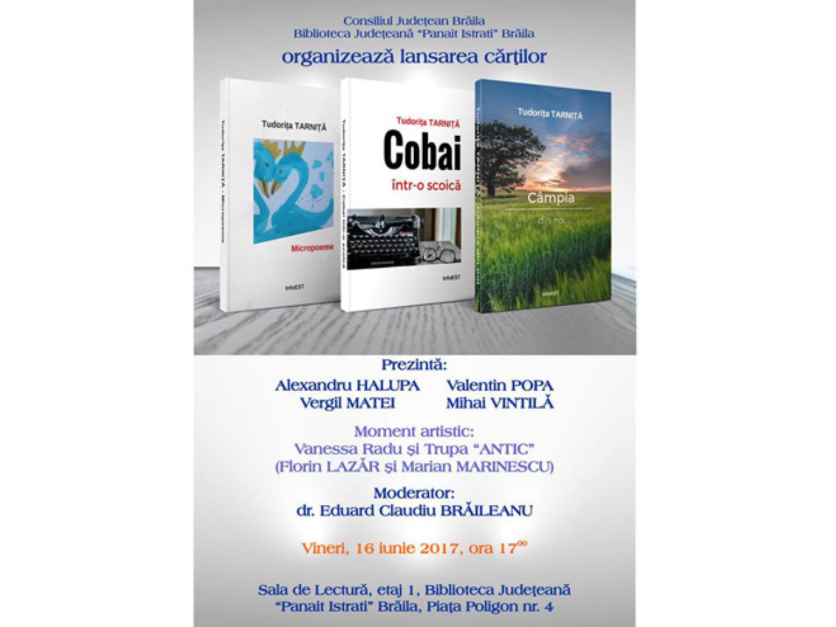 Vineri, 16 iunie, la ora 17.00, la Biblioteca Judeţeană „Panait Istrati”, are loc o triplă lansare de carte sub semnătura Tudoriţei Tarniţă, jurnalist al cotidianului “Obiectiv - Vocea Brăilei”. Colega noastră îşi face debutul în lumea literară cu volumele “Micropoeme”, “Câmpia din noi” şi “Cobai într-o scoică”, cărţi apărute la editura InfoEST.