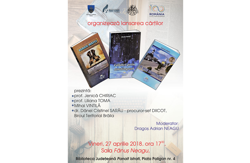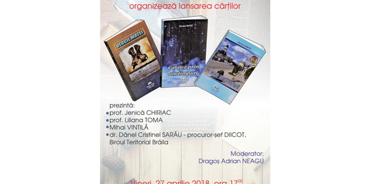 La Biblioteca Judeţeană “Panait Istrati” Brăila, sala “Fănuş Neagu”, va avea loc vineri, 27 aprilie, ora 17.00, o triplă lansare de carte: “Pe moşia Rusetteştilor”, autor Dumitru MATEI, “Călător prin anotimpuri”, de Nicolae MATEI şi “Dincolo de patul armei, de Vergil MATEI, volume apărute la Editura Lucas Brăila, în 2018.