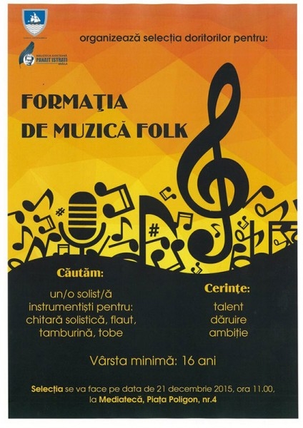 Biblioteca Judeţeană "Panait Istrati" Brăila organizează o selecţie a tinerilor pasionaţi de muzică şi dornici de a intra în formaţia de folk a instituţiei. Această acţiune, organizată în premieră pentru bibliotecile publice din România, va avea loc luni, 21 decembrie, la ora 11.00 la Secţia Mediatecă, fiind coordonată de soprana Georgeta Andrieş şi instrumentistul Nicolas Constantin.