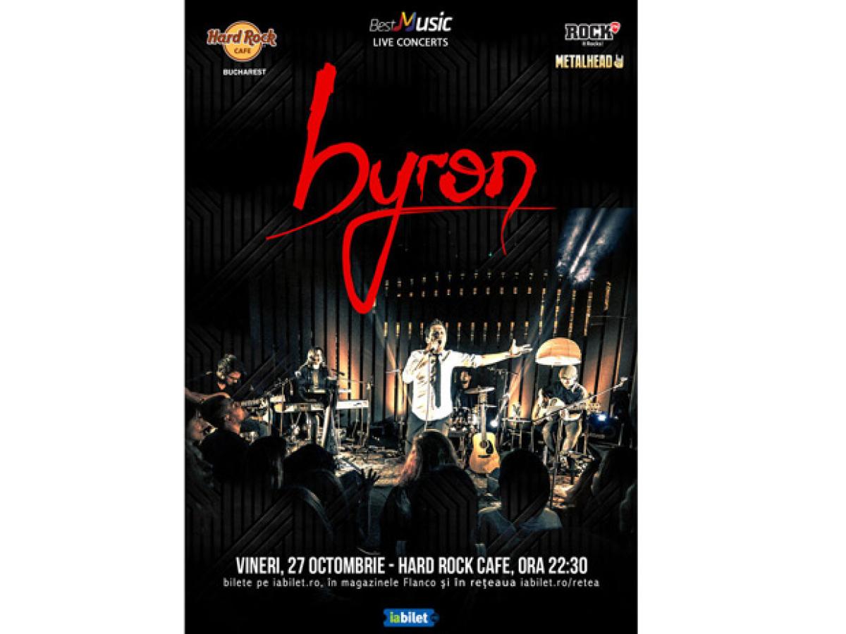 Grupul Byron va susţine un concert electrizant, mâine, în Hard Rock Cafe din Bucureşti. Show-ul este programat să înceapă la ora 22:30 şi se anunţă unul extrem de interesant. Trebuie subliniat că în cei peste 10 ani de activitate, membrii trupei Byron au lansat patru albume, au demarat proiecte promiţătoare pe care le-au şi finalizat (DVD-ul unplugged, DVD-ul de la Salina Turda, concursul Byron - Rock Your High School, musical-ul “Nevestele Vesele din Windsor”), nemaivorbind de numărul mare de concerte susţinute la festivaluri de renume sau în cluburi. În 2016 Byron au pornit şi într-un turneu în toată ţara pentru a aniversa cei 10 ani de activitate pe scenă.
