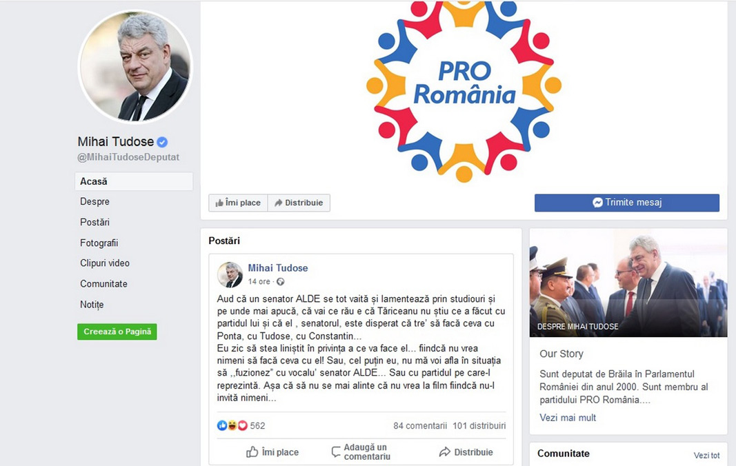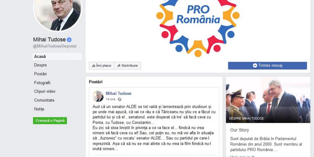 “Aud că un senator ALDE se tot vaită şi lamentează prin studiouri şi pe unde mai apucă, că vai ce rău e că Tăriceanu nu ştiu ce a făcut cu partidul lui şi că el, senatorul, este disperat că tre' să facă ceva cu Ponta, cu Tudose, cu Constantin... Eu zic să stea liniştit în privinţa a ce va face el... fiindcă nu vrea nimeni să facă ceva cu el! Sau, cel puţin eu nu mă voi afla în situaţia să «fuzionez» cu vocalu' senator ALDE... Sau cu partidul pe care-l reprezintă. Aşa că să nu se mai alinte că nu vrea la film fiindcă nu-l invită nimeni...”, a declarat Tudose pe pagina personală de Facebook.