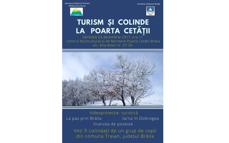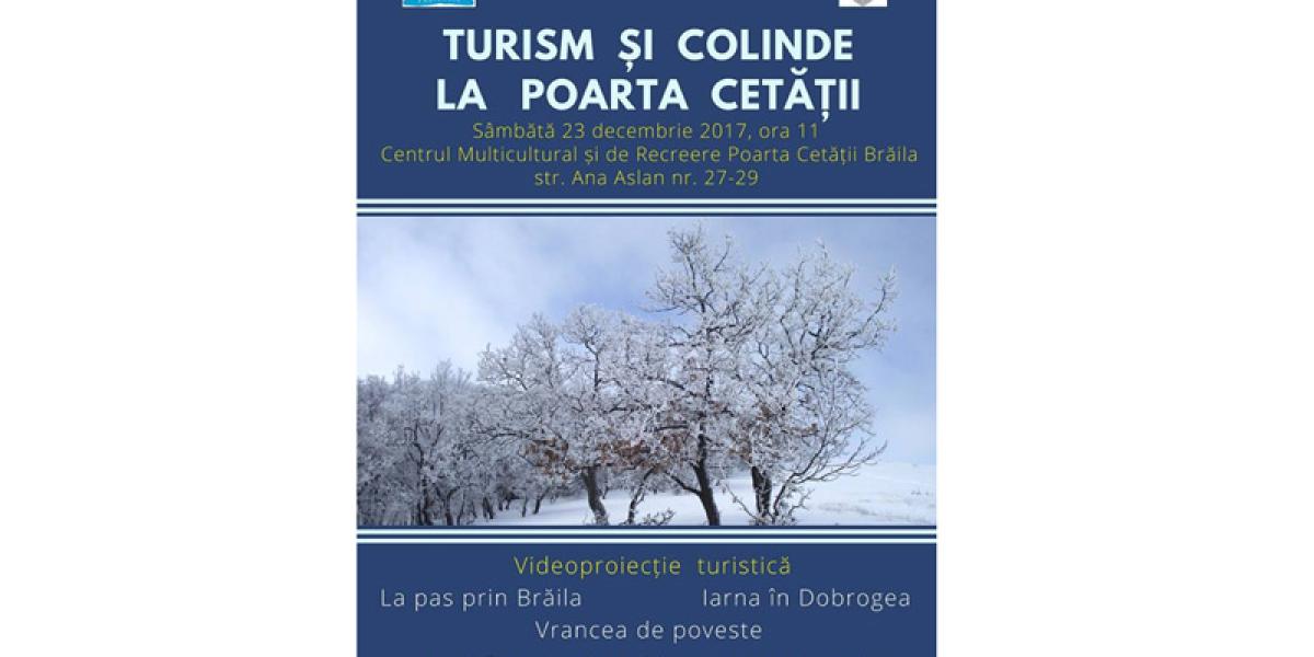 Sâmbătă, 23 decembrie 2017, ora 11.00, la Centrul Multicultural şi de Recreere “Poarta Cetăţii Brăila” din strada Ana Aslan, nr. 27-29, va avea loc un eveniment intitulat “Turism şi colinde la poarta Cetăţii”. În pragul sărbătorilor de iarnă, cei interesaţi pot viziona o videoproiecţie turistică: “La pas prin Brăila”, “Iarna în Dobrogea”, “Vrancea de poveste” şi vor fi colindaţi de un grup de copii minunaţi din comuna Traian, judeţul Brăila.