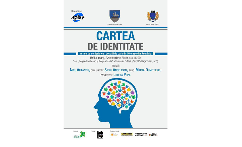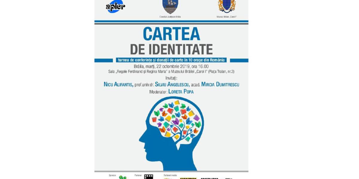 Marţi, 22 octombrie 2019, ora 16,00 la Muzeul Brăilei “Carol l”, în sala “Regele Ferdinand şi Regina Maria” va avea loc lansarea celei de a patra secvenţe aTurneului “Cartea de identitate”. Activitatea constă într-o donaţie de carte realizată de Asociaţia Publicaţiilor Literare şi Editurilor din România, urmată de o conferinţă susţinută de: maestrul Nicu Alifantis, acad. Mircia Dumitrescu şi prof. univ. dr. Silviu Angelescu.