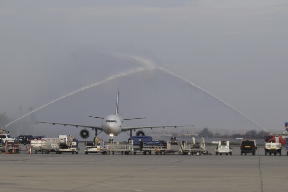 Tunuri de apă au aşteptat aeronava Airbus A310 la aterizarea sa pe Otopeni. Zborul de la Madrid a fost ultimul pe care avionul cu 209 locuri l-a făcut sub sigla TAROM.