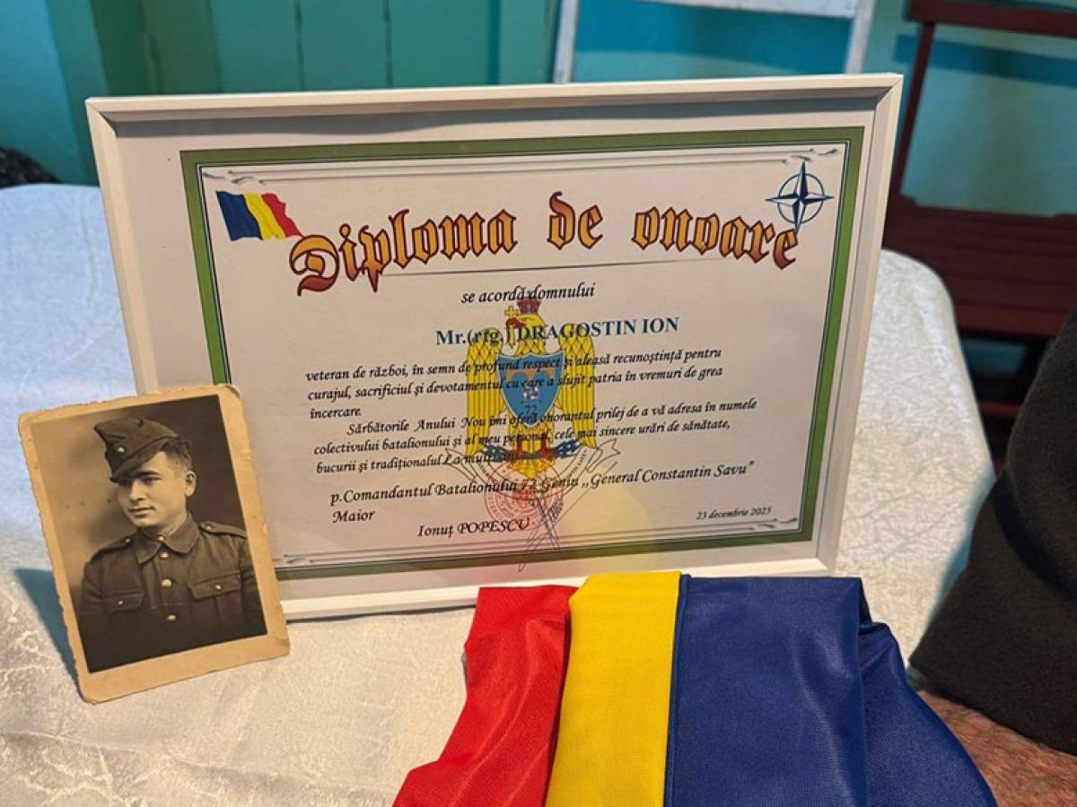 Inițiat în urmă cu opt ani, proiectul „Ranița cu merinde” - menit să le aducă un dram de speranță și să-i cinstească așa cum se cuvine pe veteranii de război din municipiu și județ în preajma Sfintelor Sărbători - l-a găsit „prezent la datorie” doar pe maiorul în retragere Ion Dragostin, din satul Oancea, comuna Romanu, cel care, anul acesta, ar putea ajunge la venerabila vârstă de 103 ani. Ultimul veteran de război din Brăila - artilerist antiaerian în timpul conflagrației mondiale - i-a avut alături, în Ajun de Crăciun, pe membrii Asociației Naționale Cultul Eroilor „Regina Maria” - Filiala județenă Brăila „General Stan Poetaș”, pe primarul comunei Romanu, Steluța Ioniță, și pe reprezentanții Batalionului 72 Geniu „General Constantin Savu”, din cadrul Brigăzii 10 Geniu „Dunărea de Jos”.