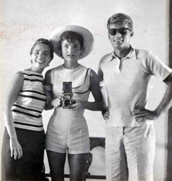 În acest "selfie", cei trei poartă ţinute lejere de plajă, albe, iar Jacqueline Kennedy, care ţine în mâini un aparat de fotografiat, poartă şi o pălărie de soare, informează huffingtonpost.com.