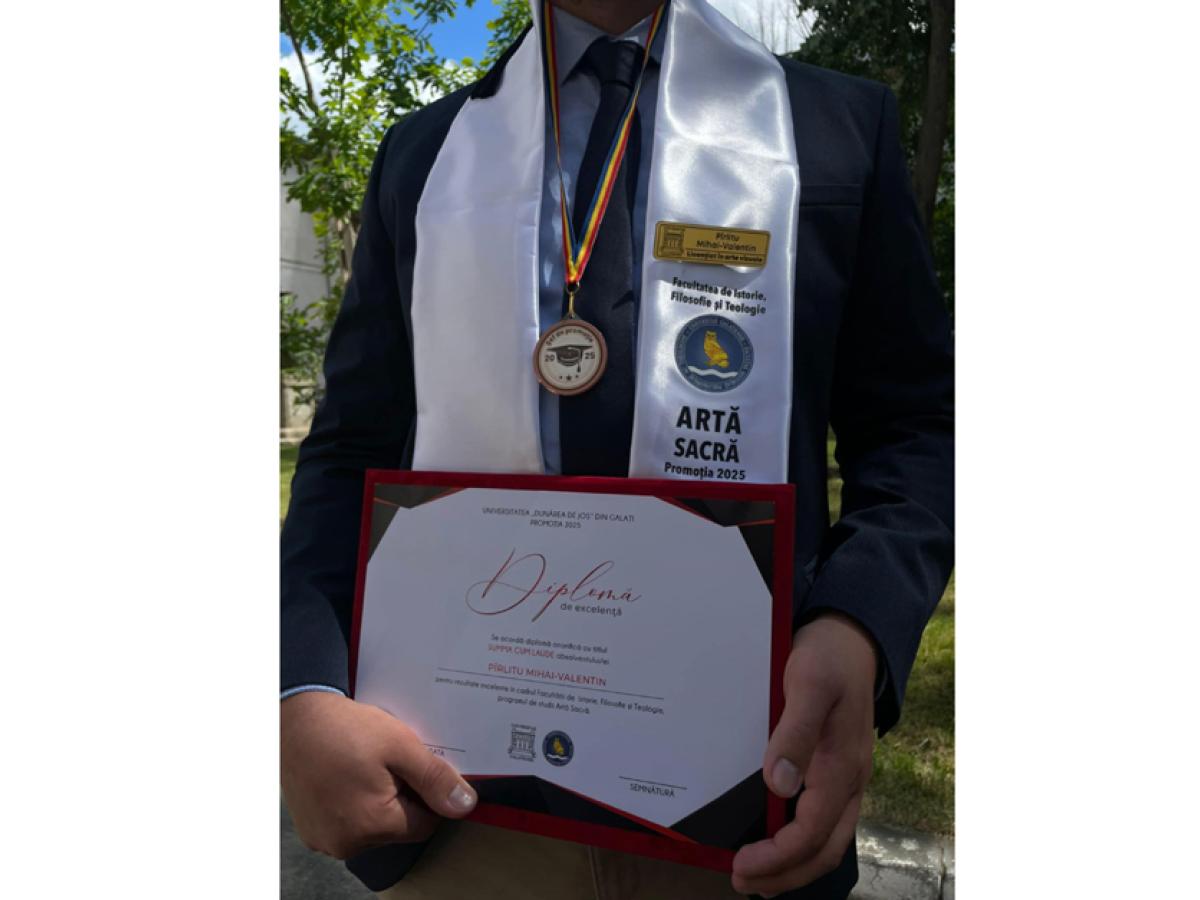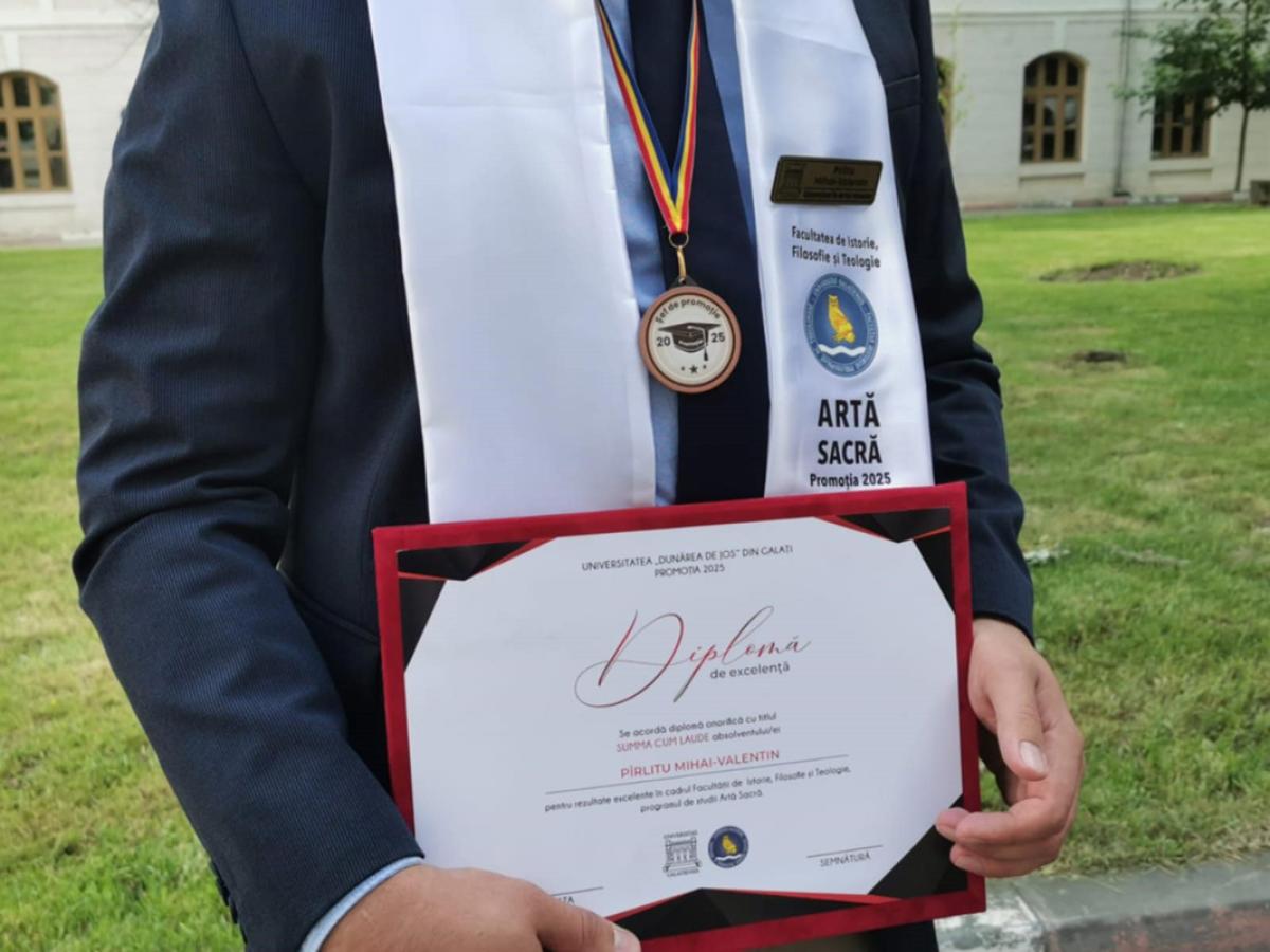 • absolvent al Liceului „Hariclea Darclee” Brăila și al Facultății de Arhitectură Navală, Mihai-Valentin Pîrlitu a absolvit, anul acesta, specializarea Artă Sacră (departamentul Teologie) din cadrul Facultății de Istorie, Filosofie și Teologie - Universitatea „Dunărea de Jos” Galați • cu media 9,86, pictorul iconar, fiul al satului Valea Cânepii, a fost șef de promoție, iar acum intenționează să urmeze cursuri de masterat și de pictură bisericească, organizate de Patriarhia Română • „Le mulțumesc profesorilor și preacucernicilor părinți, pentru cunoașterea pe care mi-au împărtășit-o în acești ani, precum și Înaltpreasfințitului prof. univ. dr. Casian Crăciun, Arhiepiscopul Dunării de Jos, pentru grija pe care a purtat-o studenților, ca un părinte iubitor”, a spus Mihai-Valentin