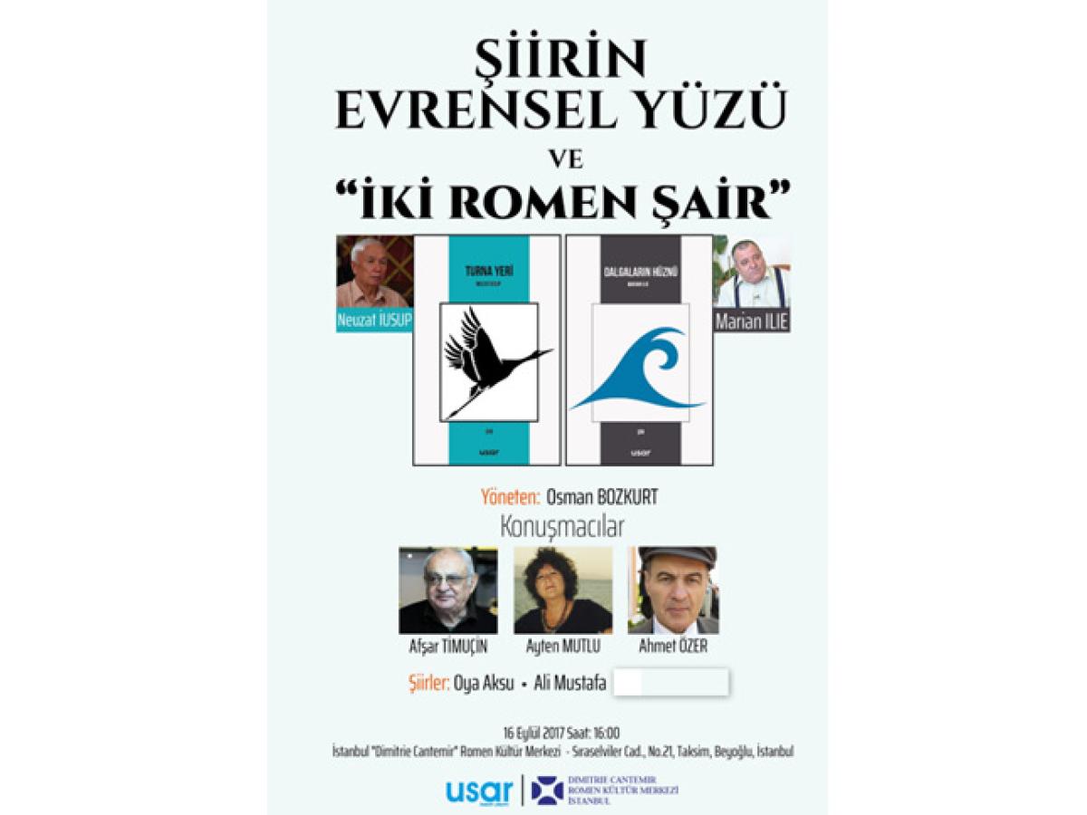 Institutul Cultural Român „Dimitrie Cantemir” de la Istanbul a fost, luna trecută, gazda unui eveniment editorial inedit. Este vorba despre o dublă lansare de carte: primul volum de poezie scris în limba turcă de un autor român contemporan - “Turna Yeri” (Locul berzei) - de Neuzat Iusup (Nevzat Yusuf Sarigöl) şi primul volum de poezie românească tradusă în limba turcă de către autorul însuşi - “Dalgalarin Hüznü” (Tristeţi pontice) - de Marian Ilie. Ambele volume au apărut în iunie 2017 la Editura UŞAR, una dintre cele mai cunoscute edituri din Istanbul.