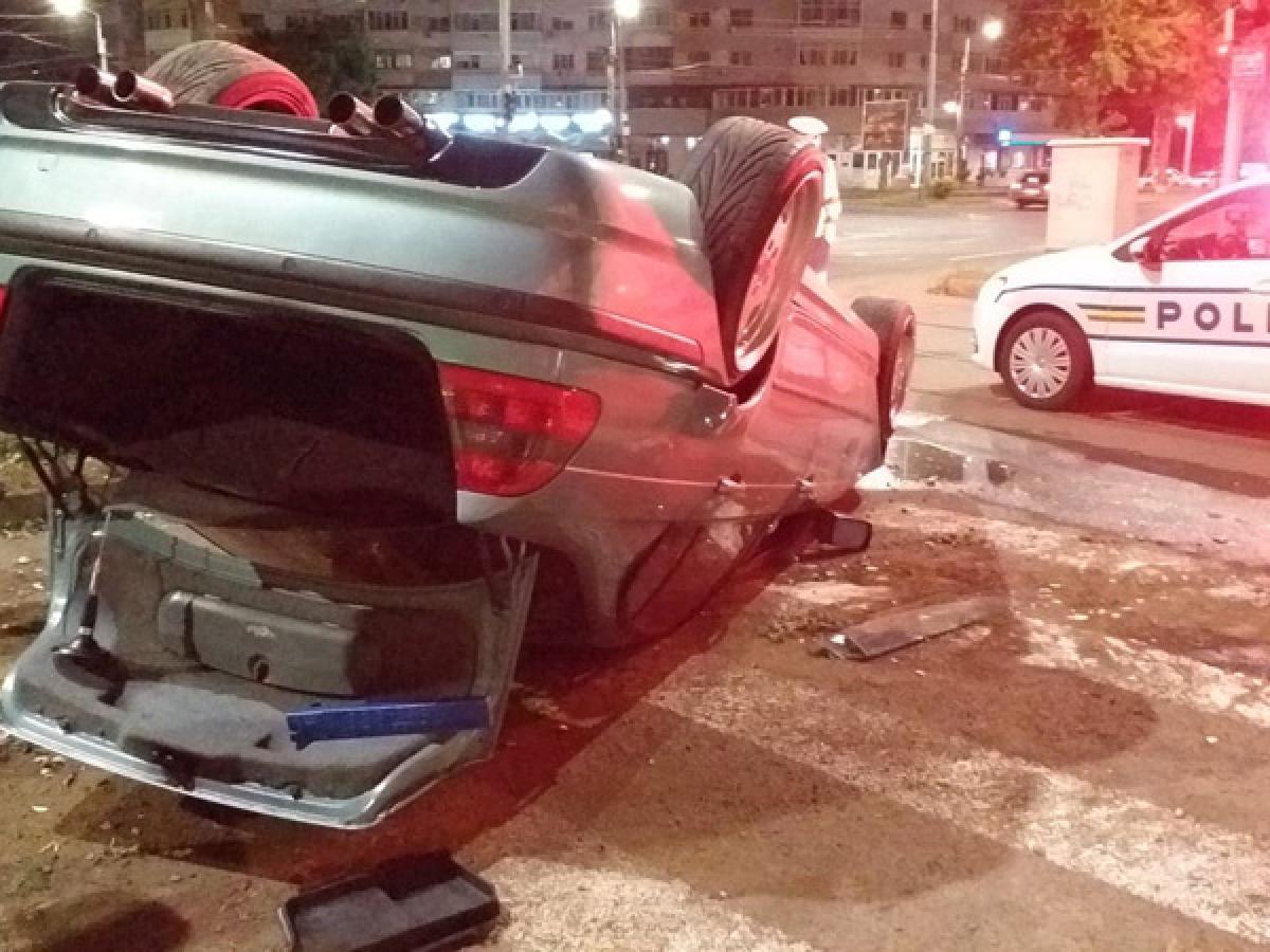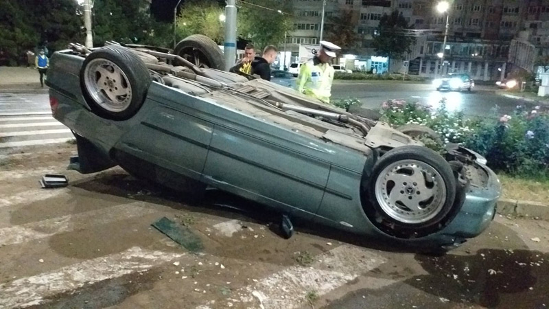 • în noaptea de miercuri spre joi, un şofer de 23 de ani conducea autoturismul pe Calea Călăraşilor şi nu a adaptat viteza la schimbarea direcţiei de mers • la intersecţia cu Bulevardul Dorobanţilor, tânărul vitezoman s-a răsturnat cu BMW-ul chiar pe marcajul pietonal