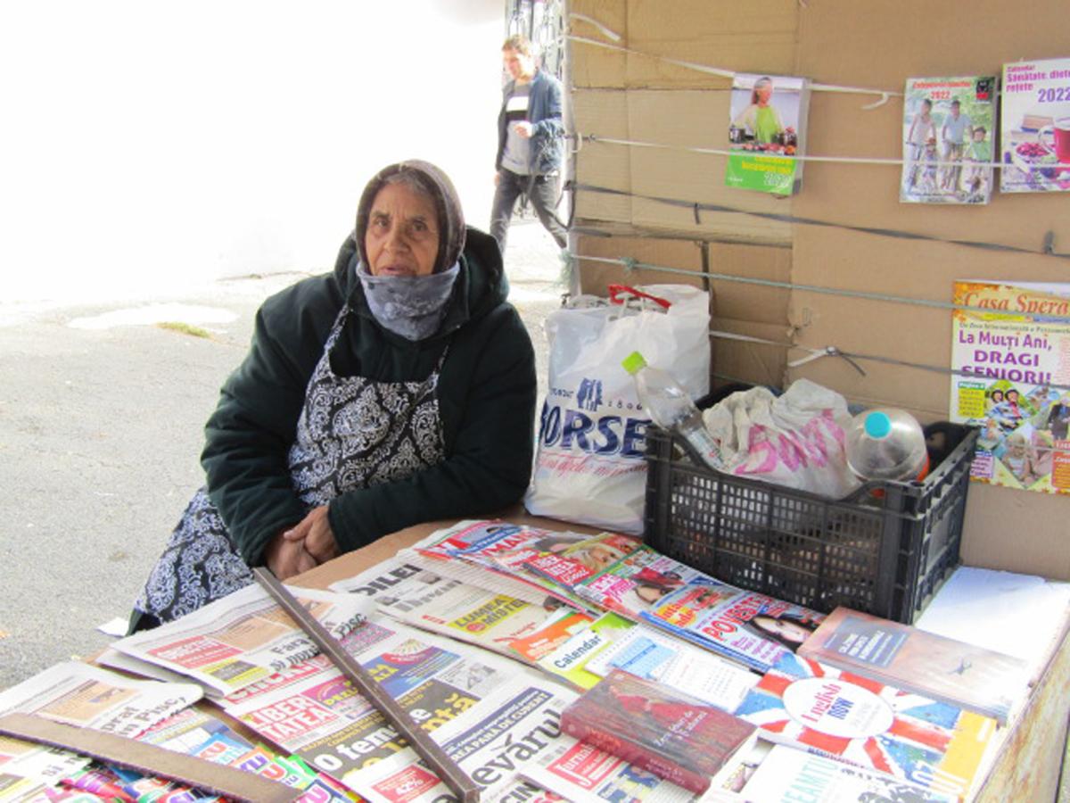 * fie caniculă, ploaie sau ger, pensionara care vinde ziare și reviste în zona pieței Libelula este prezentă la datorie, la taraba ei improvizată care nu o apără de intemperii