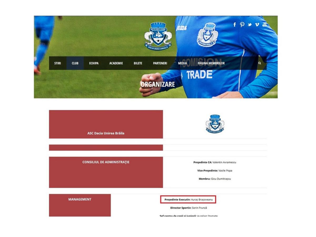 • este vorba despre preşedintele executiv al clubului, Auraş Braşoveanu, cunoscut până nu demult şi ca reprezentant al Ligii a II-a în Comitetul Executiv al Federaţiei Române de Fotbal • acesta “tronează” bine mersi pe postul de conducere de la “Dacia Unirea”, deşi are o condamnare la 1 an şi 4 luni de închisoare cu suspendare şi interzicerea de a mai ocupa funcţii publice, timp de 2 ani • condamnat definitiv în 2016, Braşoveanu fusese acuzat de procurorii DNA că a falsificat documente în baza cărora a obţinut finanţare de la autorităţile gălăţene pentru un club sportiv • acesta se apără şi susţine că interdicţia sa se referă strict la funcţia de “administrator”, poziţie pe care nu a ocupat-o la clubul brăilean • preşedintele CA “Dacia Unirea”, Valentin Avramescu, nu a putut fi contactat pentru a-şi expune punctul de vedere • liderii administraţiei brăilene afirmă la unison că este strict problema clubului privat, însă fac apel la rezolvarea grabnică a acestei situaţii • în total, Primăria şi CJ Brăila au alocat, în 2017, peste 636.000 lei clubului Dacia Unirea - bani publici