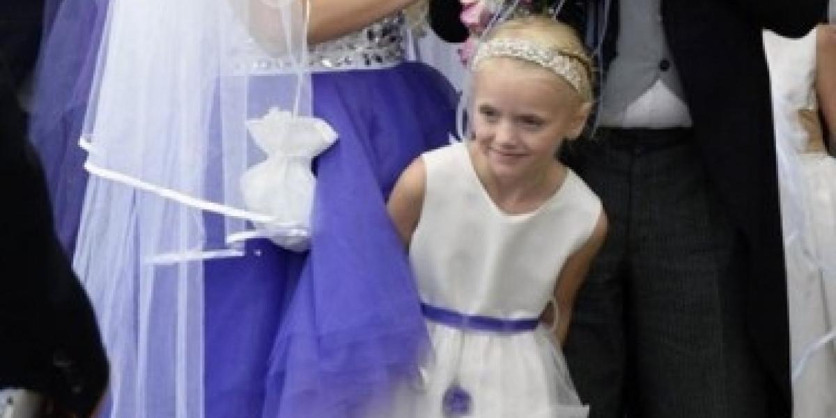 Mireasa a părut un personaj desprins din filmele animate produse de studiourile Disney. Rochia ei a constat într-o bustieră decorată cu numeroase pietre preţioase, o rochie lungă şi vaporoasă de culoare mov şi un voal alb.