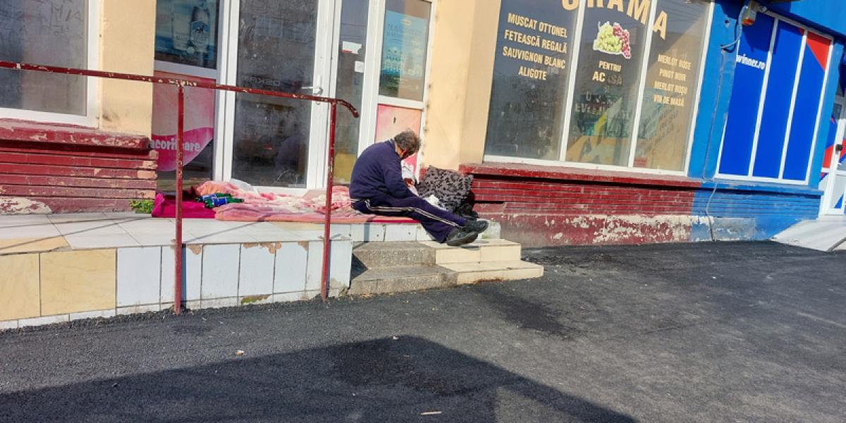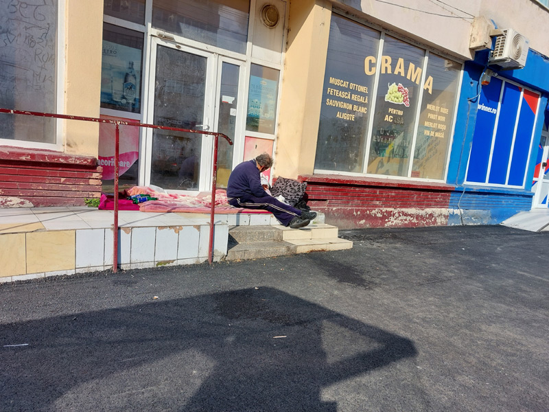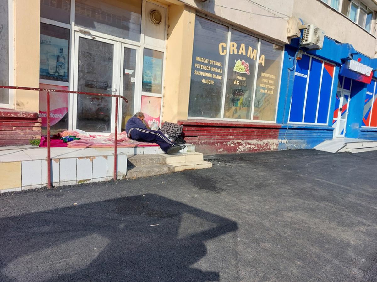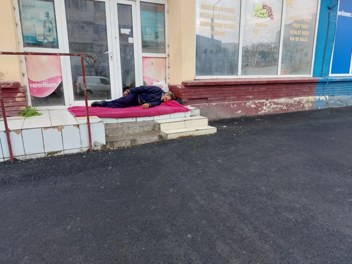 • de mai multe zile, pe treptele unei foste crame de pe Calea Galați, aproape de stația de autobuz 2, s-a aciuat un om al străzii • locatarii din zonă spun că nu mai pot tranzita zona din pricina mirosului pestilențial • trotuarul pe care se află omul străzii a fost refăcut recent de firma „Micatis” SRL, plătită de municipalitate