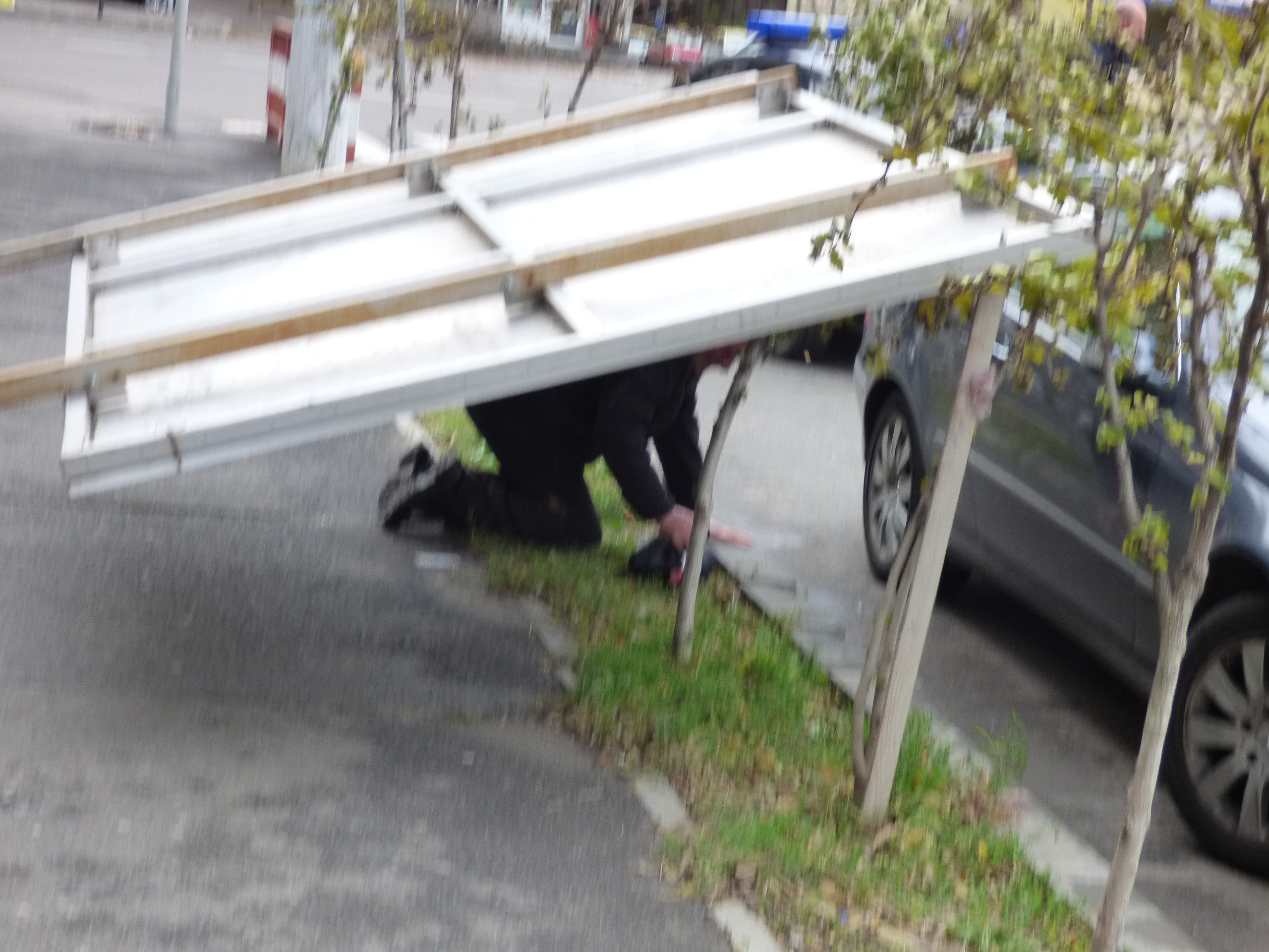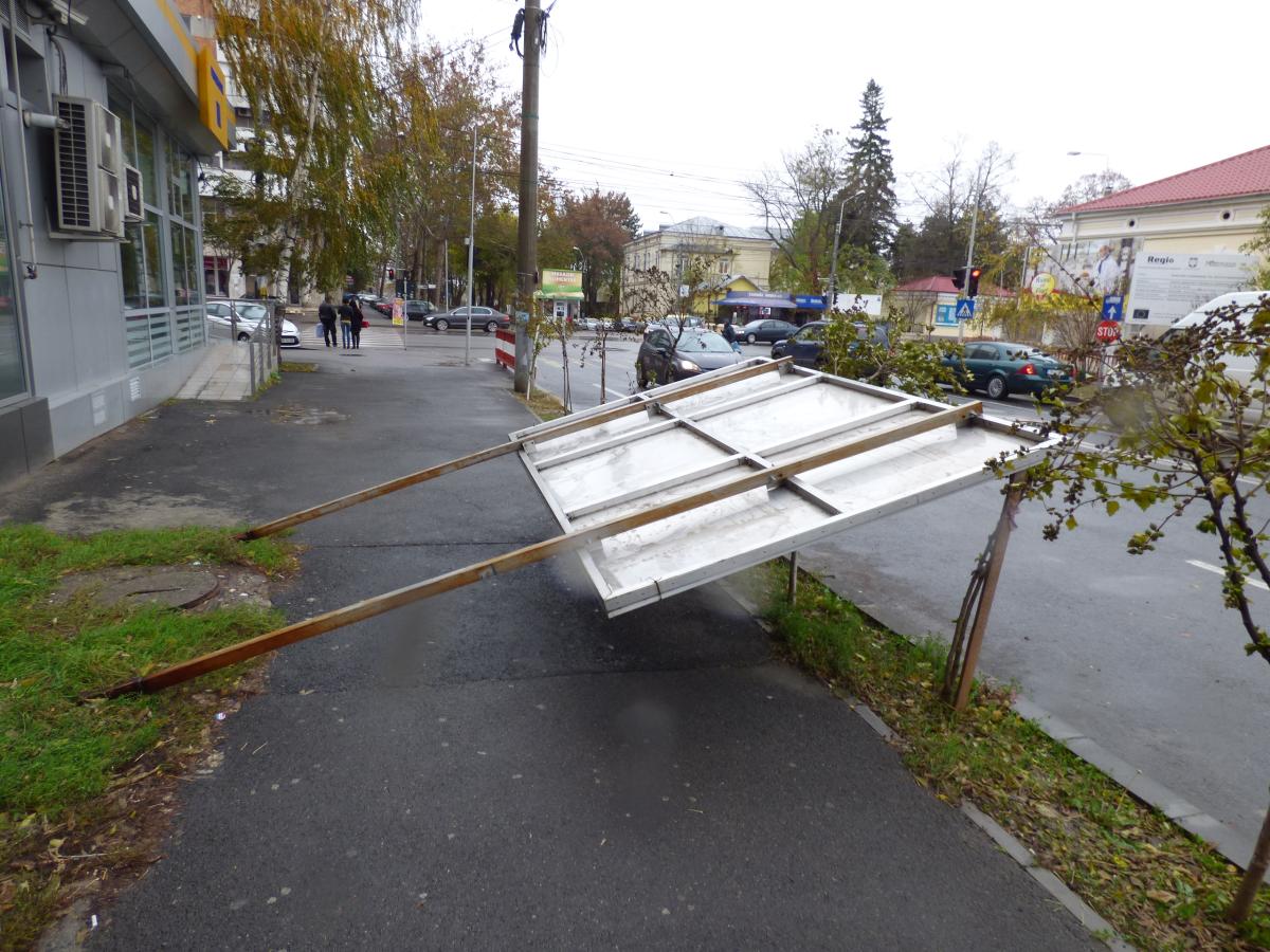 * panoul, cu care autorităţile se lăudau despre investiţia făcută în urmă cu câţiva ani, pentru reabilitarea străzii Griviţei, a mai fost doborât de vânt, fiind reparat superficial şi repus pe poziţie * pensionarul lovit a ajuns la spital