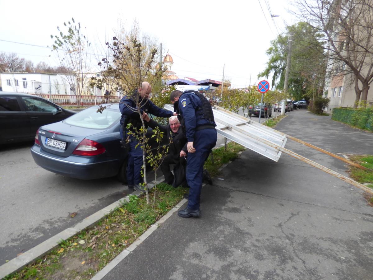 Un pensionar brăilean şi-a văzut moartea cu ochii în această după-amiază, în timp ce mergea pe trotuarul străzii Griviţei, în zona Pieţei Concordia, din cauza unui panou metalic care a fost trântit la pământ de vântul puternic. Fost maistru constructor, brăileanul G.E. făcuse cumpărături în Piaţa Concordia şi se îndrepta spre casă, în momentul când panoul pe care erau înscrise datele reabilitării străzii Griviţei a căzut peste el. Un echipaj de jandarmi aflat în zonă a sărit imediat în ajutorul bătrânului. Speriat şi confuz, acesta acuza dureri puternice de cap, iar jandarmii au solicitat intervenţia unei ambulanţe, care l-a transportat la spital.