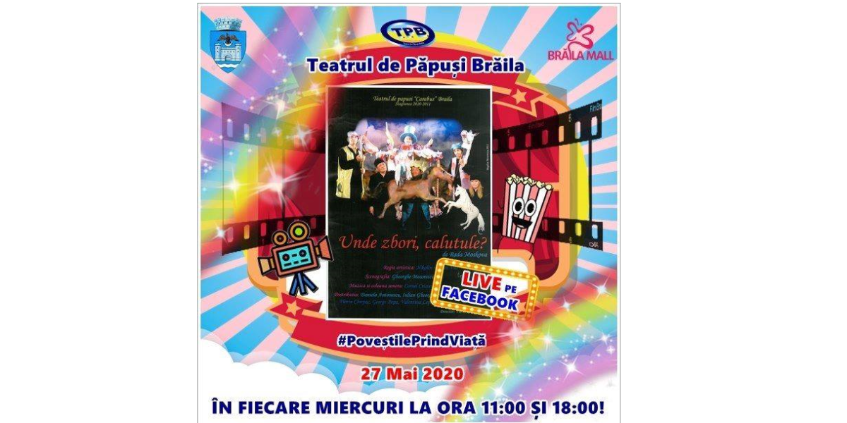 Astăzi, 27 mai 2020, de la ora 11:00 și 18:00 Teatrul de Păpuși CĂRĂBUȘ transmite live pe pagina de Facebook dar și pe pagina de Facebook Brăila Mall spectacolul înregistrat ''Unde zbori căluțule?''. Brăilenii sunt așteptați cu mic cu mare să descopere aventurile micului căluț alături de prietenii săi.