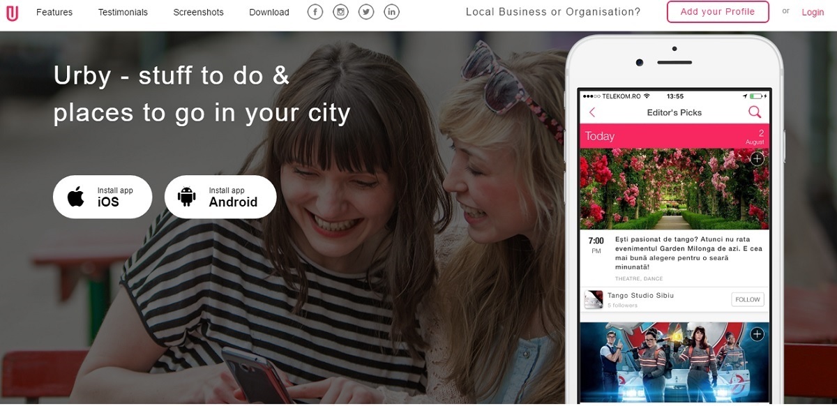 Ce găsești concret în Urby? În primul rând, evenimente, organizate pe categorii precum: concerte, expoziții, evenimente sportive, festivaluri, petreceri cu tematică, piese de teatru, evenimente pentru copii etc. Apoi, liste cu servicii locale: instituții, restaurante, pub-uri, spa-uri, saloane, banci, cluburi sportive, farmacii, muzee, trasee turistice etc. Și nu în ultimul rând un flux complet de informații locale și recomandări ale altor utilizatori.