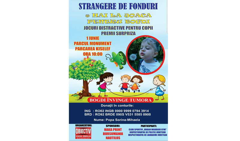 Ziua cea mare a sosit! Multe emoţii şi un infinit de gânduri bune pentru micuţul Bogdi, ambalate frumos într-un eveniment caritabil, se vor răspândi, astăzi, în Parcul Monument. Cotidianul “Obiectiv - Vocea Brăilei”, alături de Inspectoratul de Poliţie Judeţean, Inspectoratul de Jandarmi Judeţean, Club Sportiv “Urban Warrior Gym”, Asociaţia Sportivă “Prietenii lui Flipper” şi o frumoasă mămică din municipiu ce s-a oferit să se ocupe de Face Painting pentru copilaşi vă aşteaptă de la ora 10.00 în Parcul Monument, parcarea Kiseleff (intrarea vizavi de fostul Liceu de Chimie), pentru a strânge cât mai mulţi bănuţi pentru Bogdi. Ne jucăm, ne distrăm şi donăm!