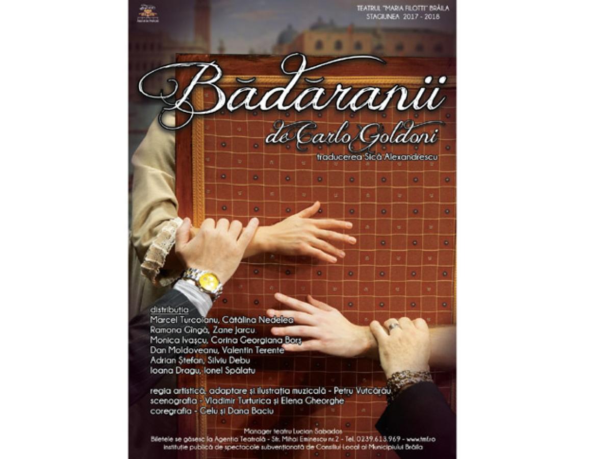 “Bădăranii”, comedie clasică în trei acte, pusă prima dată în scenă în 1760 la Teatro San Luca cu ocazia Carnavalului de la Veneţia, cu o istorie remarcabilă în teatru, dar şi în cinematografie, text mereu actual, un veritabil eveniment social, cu caractere înfăţişate de Goldoni direct, aspru, fără convenţii stereotipe, fără improvizaţii cu alunecări în grotesc şi vulgaritate, în care măştile şi costumele de bâlci au fost înlocuite cu fizionomii. O capodoperă a dramaturgiei pusă în scenă la Teatrul “Maria Filotti” de reputatul regizor şi director al Teatrului Naţional Eugene Ionesco din Chişinău, Petru Vutcărău.