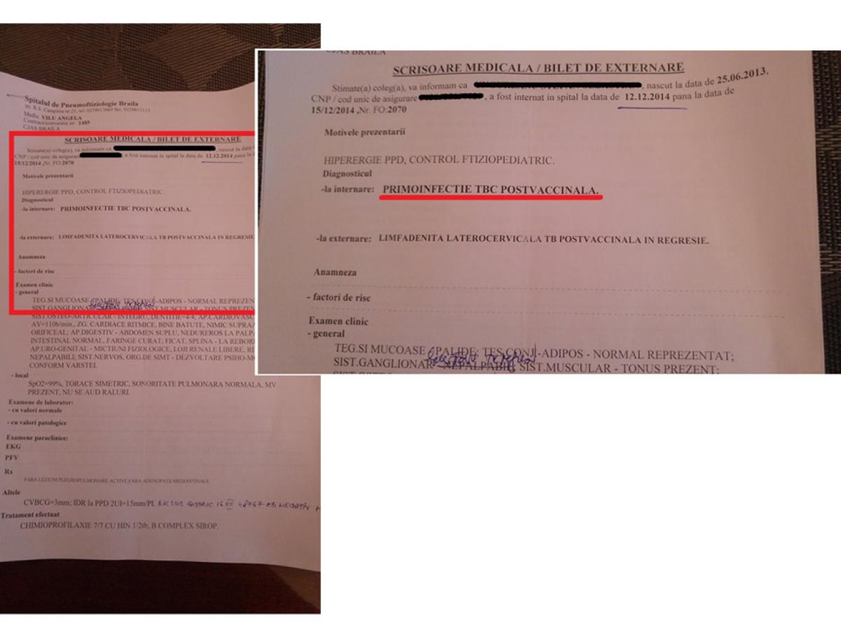 Documentele medicale, pe care Narcisa Bădin ni le-a prezentat, confirmă faptul că băieţelul său a avut de suferit de pe urma vaccinării cu BCG, diagnosticul fiind “primoinfecţie TBC postvaccinale”. Ciudat este însă faptul că medicii care identifică aceste reacţii adverse ale vaccinurilor ar trebui să raporteze imediat la direcţiile de sănătate publică, ori la DSP Brăila acest caz este necunoscut, deşi primul diagnostic de reacţie postvaccinală a fost stabilit în 2014.