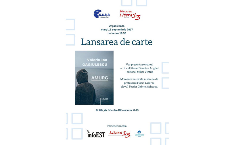Marţi, 12 septembrie 2017, de la ora 16.30, la sediul Casei de Ajutor Reciproc a Pensionarilor din Brăila (C.A.R.P.) “Ana Aslan”, din strada Nicolae Bălcescu nr.8-10, va avea loc lansarea volumului “Amurg”, al scriitorului Ion Valeriu Găgiulescu.