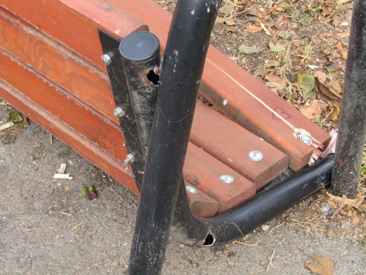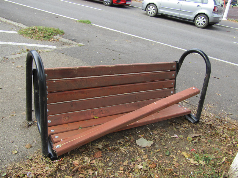 • bancă nouă, recent montată, distrusă complet de o gașcă de indivizi, probabil beți sau chiar drogați • nu e prima dată când în zonă se întâmplă un astfel de incident, locatarii blocurilor fiind efectiv terorizați de derbedeii care fac gălăgie și se manifestă agresiv până târziu în noapte