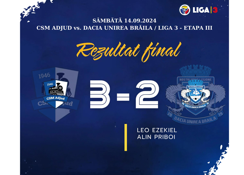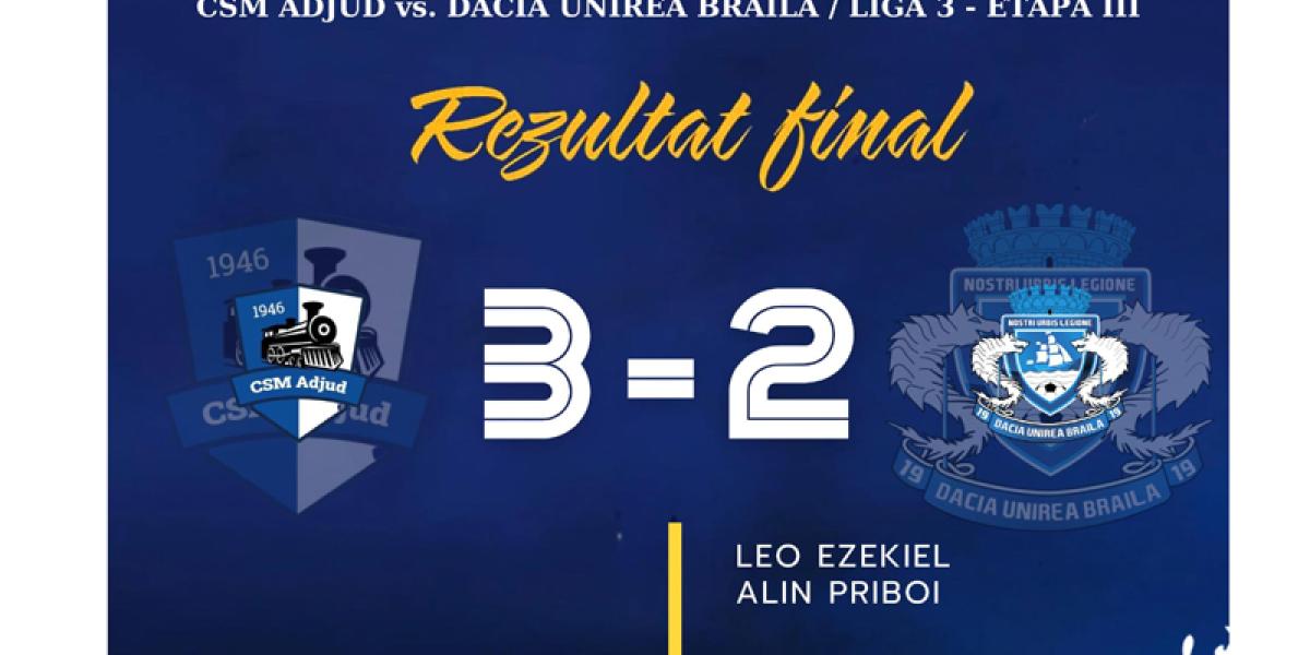 Dacia Unirea a pierdut cu 3-2 la CSM Adjud, aceasta fiind a treia înfrângere consecutivă din turului actualului sezon competițional. Iar dacă în campionatul precedent, după trei runde avea maximum de puncte, acum formația brăileană, cu zero puncte, se află pe ultimul loc al Seriei a II-a din Liga a III-a.