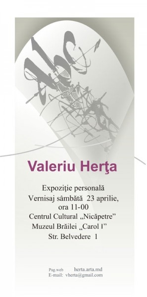 Sâmbătă, 23 aprilie 2016, ora 11.00, la Centrul Cultural „Nicăpetre" va avea loc vernisajul expoziţiei personale Valeriu Herţa, designer şi grafician, preşedintele secţiei Grafică a Uniunii Artiştilor Plastici şi preşedintele secţiei Ex Libris a Societăţii Bibliofililor, ambele asociaţii din Republica Moldova.