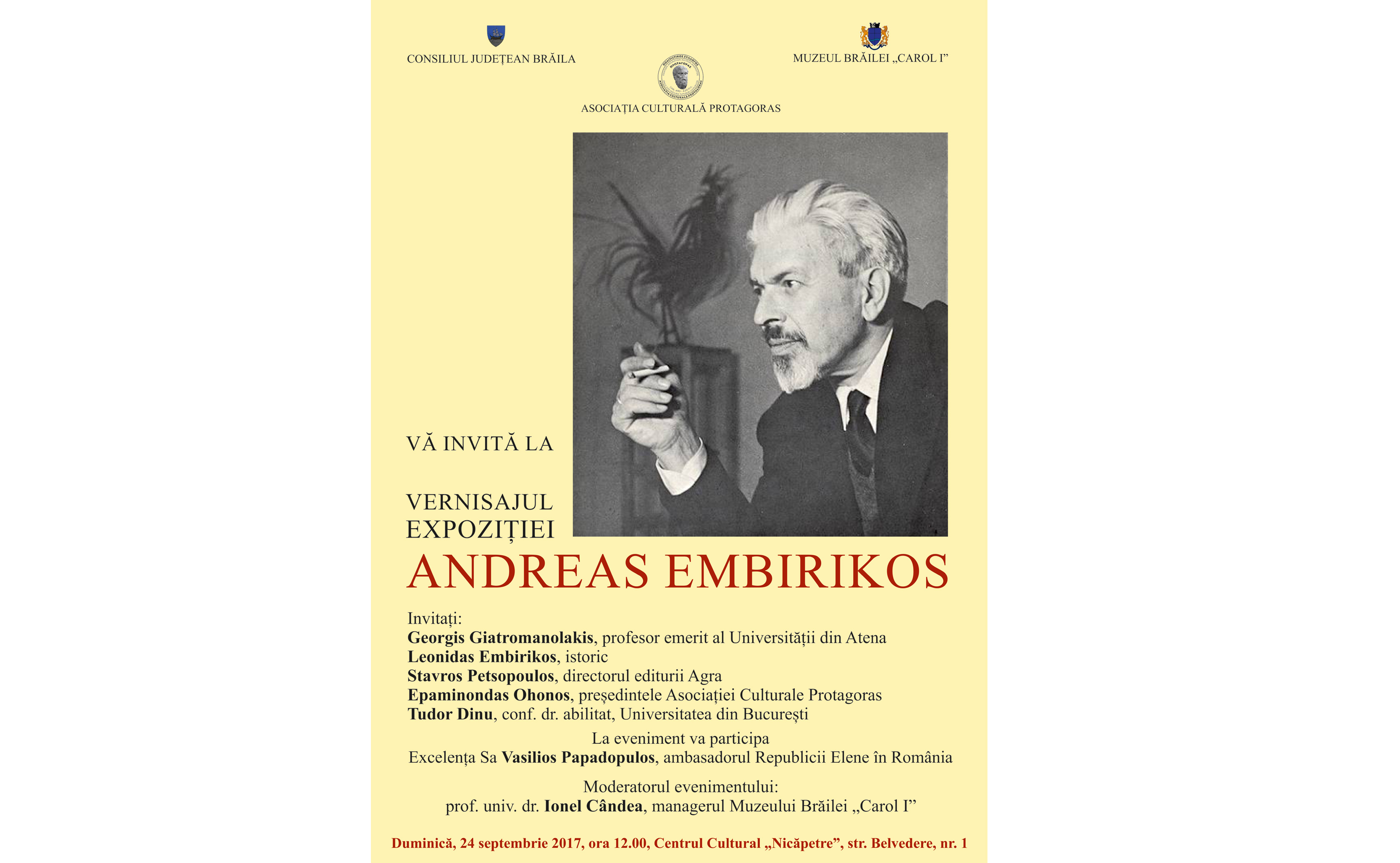 Duminică, 24 septembrie 2017, ora 12.00, la Centrul Cultural “Nicăpetre” din strada Belvedere, nr. 1 are loc vernisajul expoziţiei Andreas Embirikos. La evenimentul moderat de prof. univ. dr. Ionel Cândea, managerul Muzeului Brăilei “Carol I”, va participa şi Excelenţa Sa Vasilios Papadopulos, ambasadorul Republicii Elene în România. Printre invitaţi se mai numără: Georgis Giatromanolakis, profesor emerit al Universităţii din Atena,